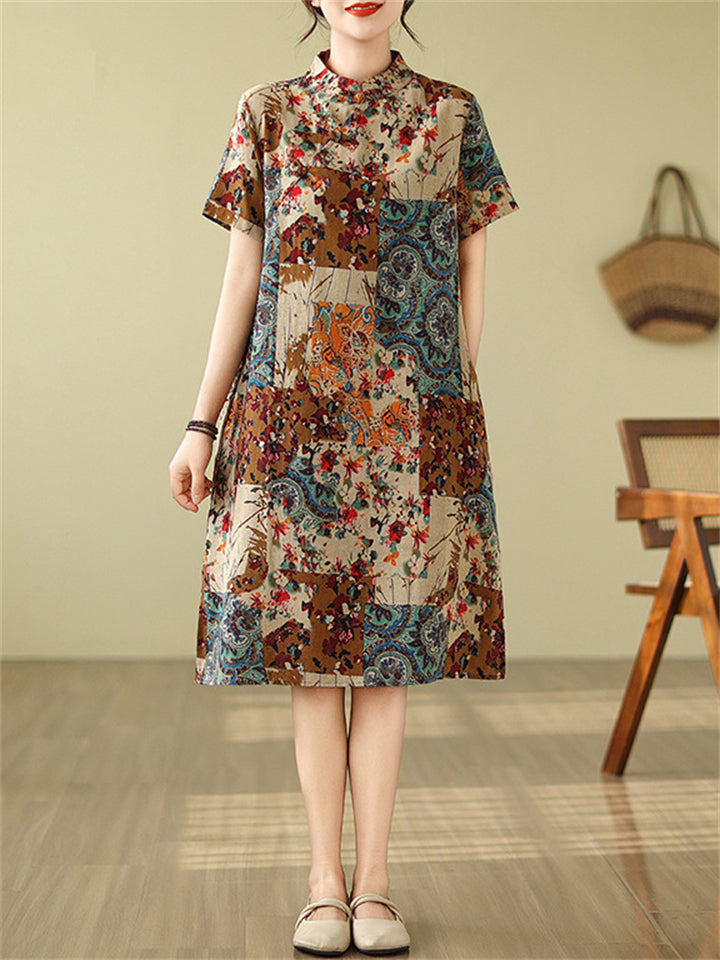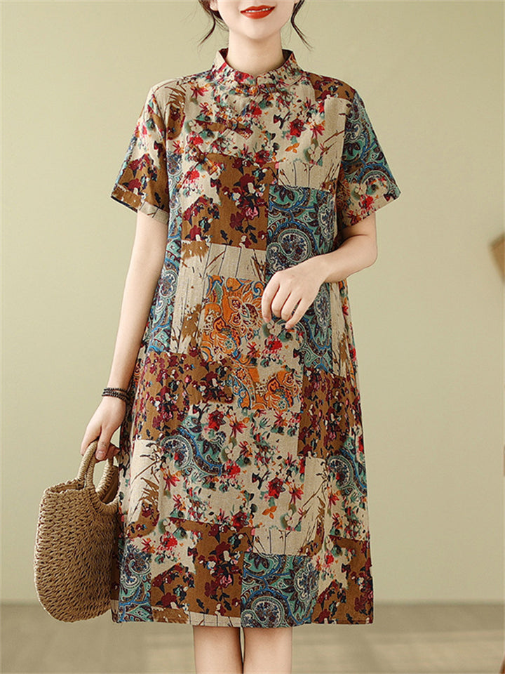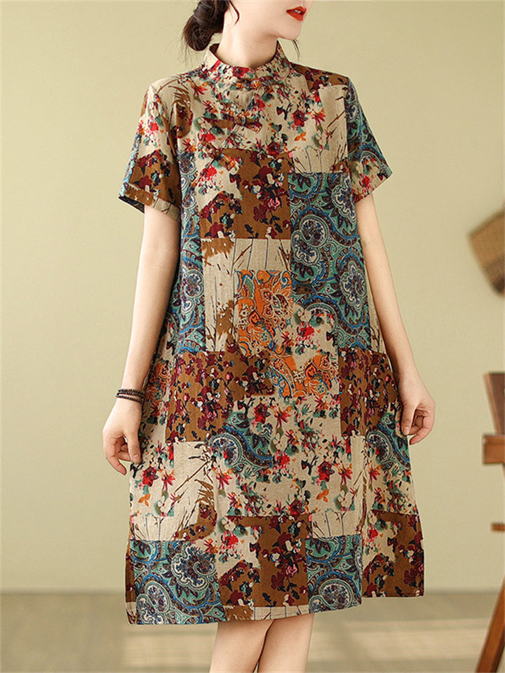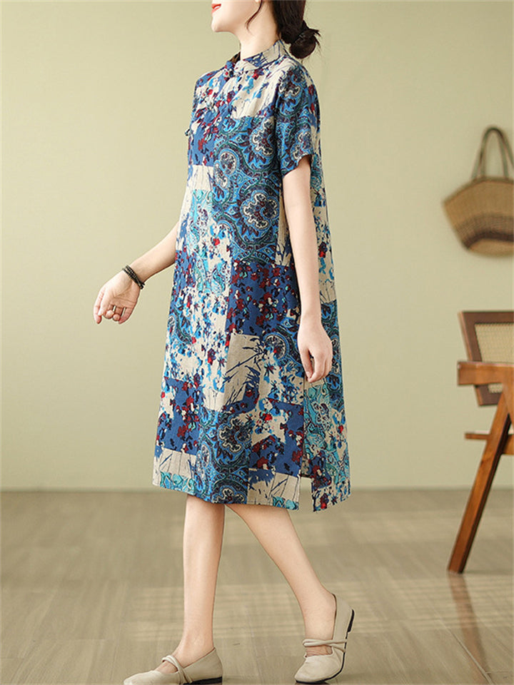Women's Retro Ethnic Style Print A-Line Cheongsam Midi Dress
