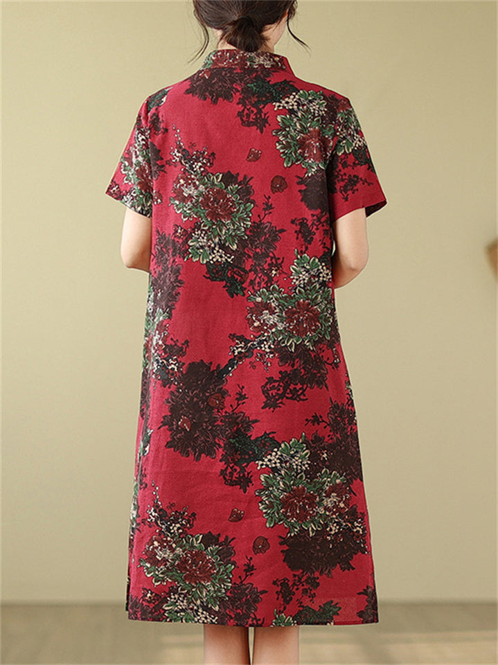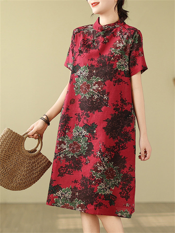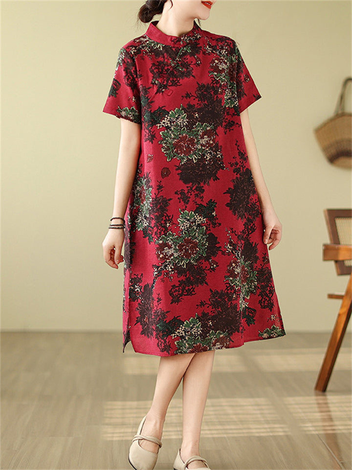 Women's Retro Flowers Print Red A-Line Cheongsam Dress