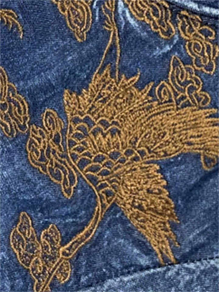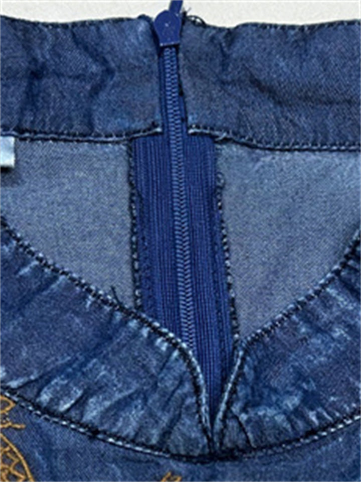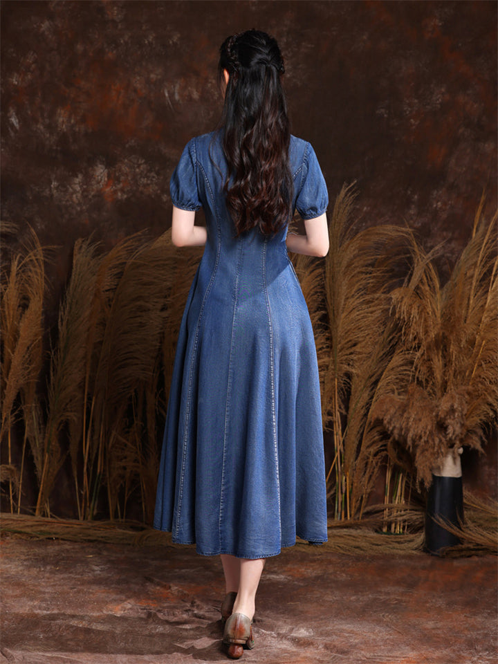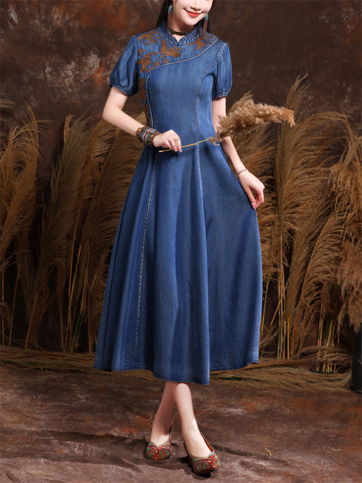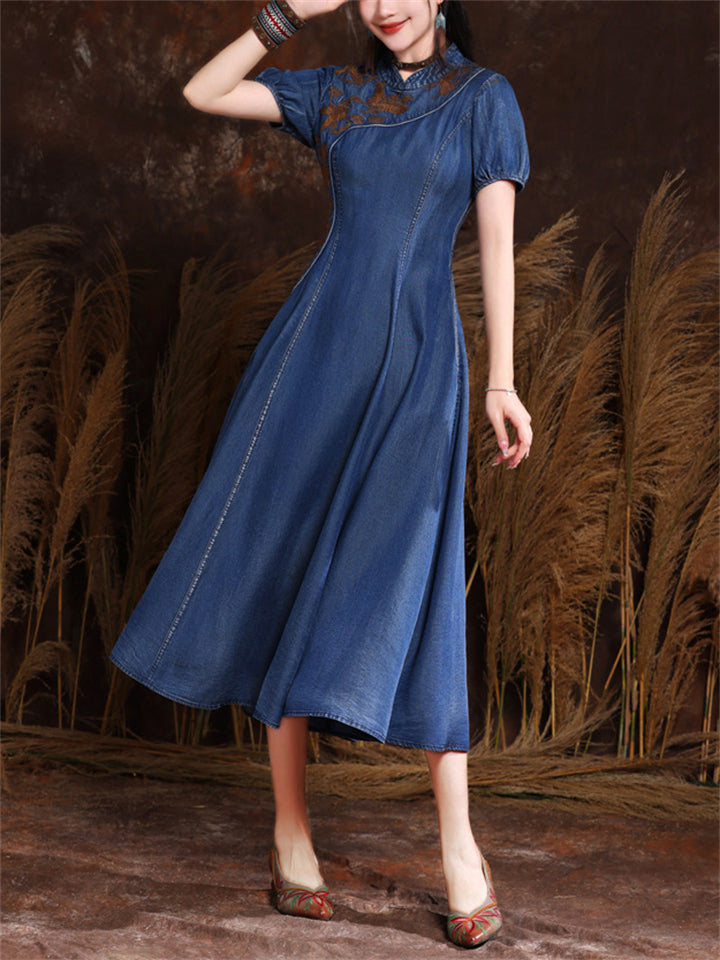 Women's Retro Neckline Embroidery Mid Length A-Line Denim Dress