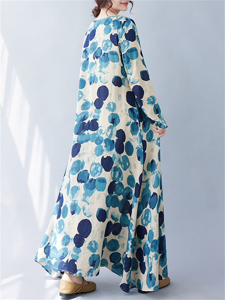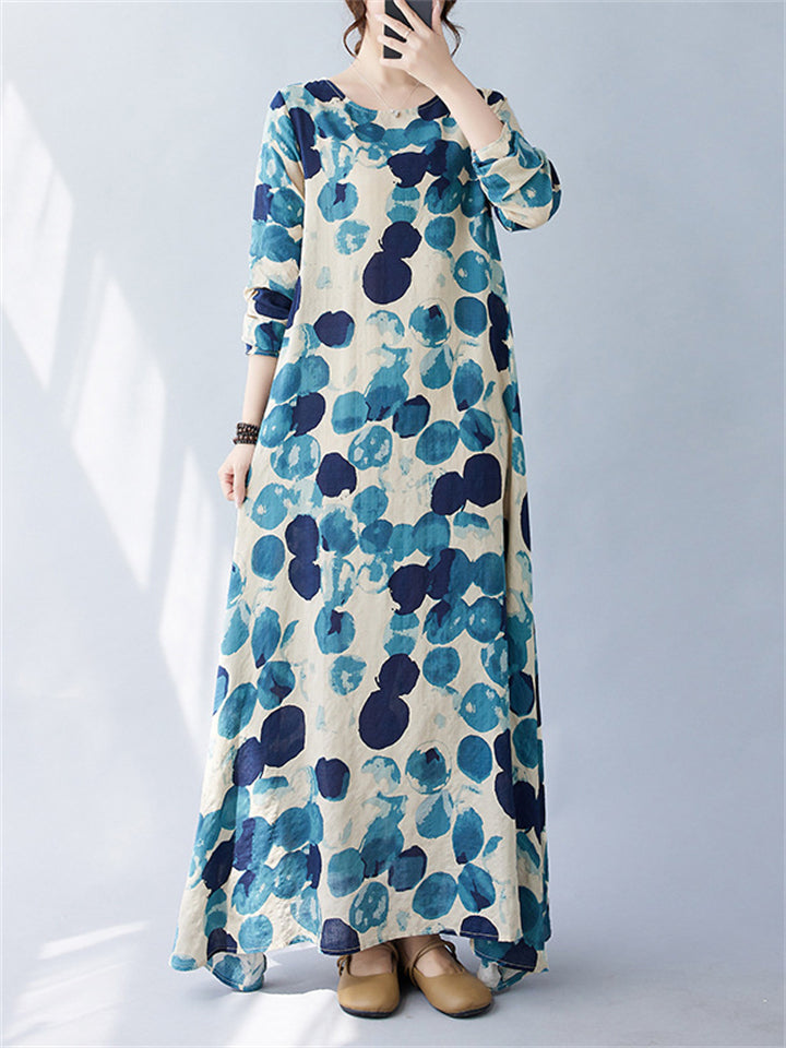 Women's Round Neck Blue Polka Dots Casual Maxi Dress