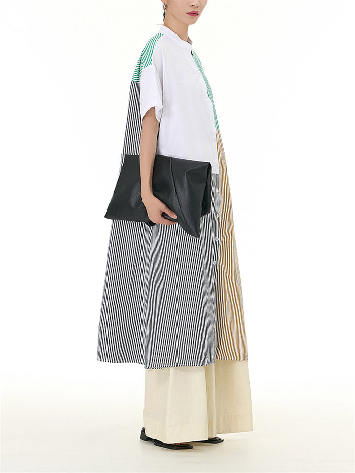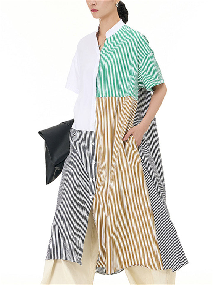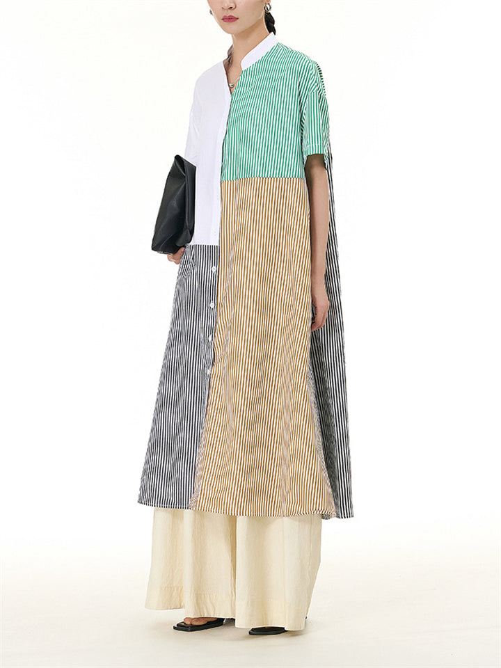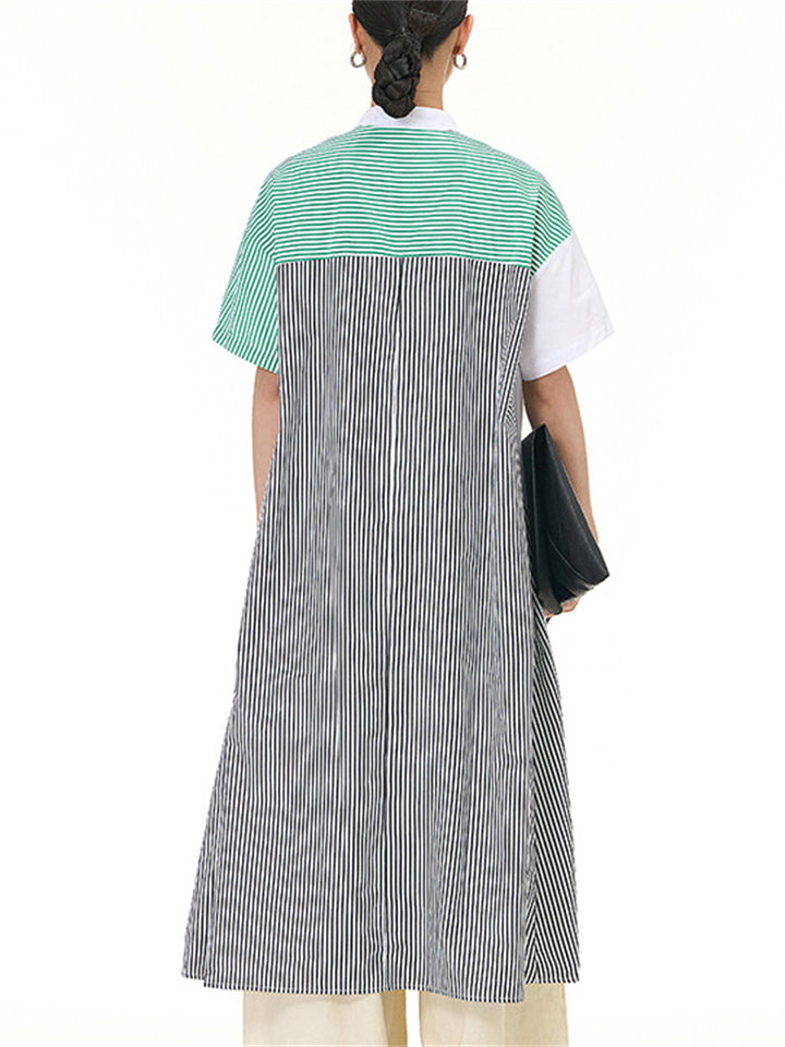 Women's Short Sleeve Vertical Stripe Patchwork A-Line Shirt Dress