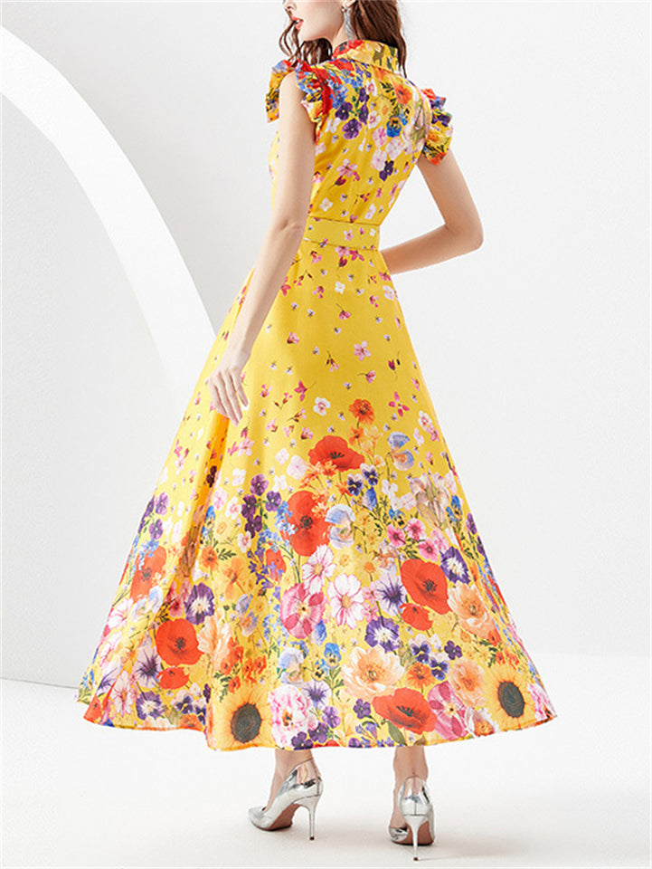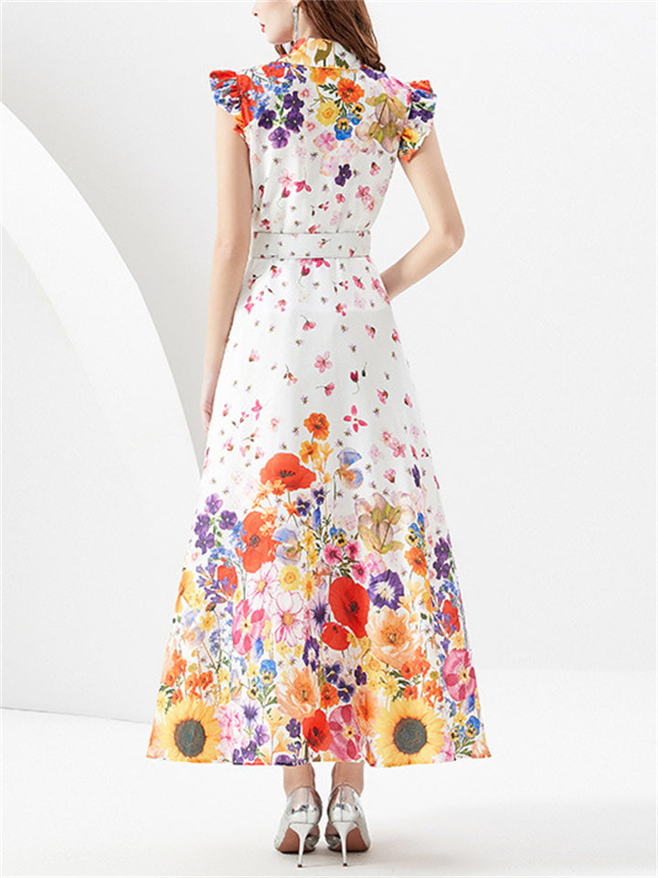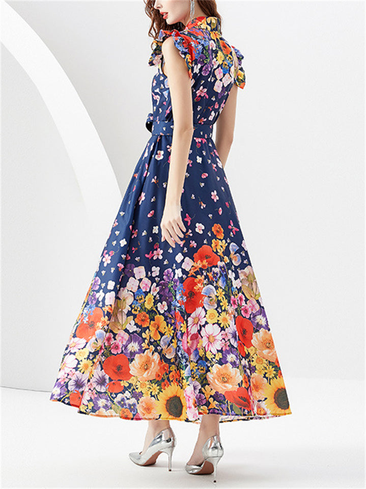 Women's Summer Elegant Flowers Printed V Neck Sleeveless Dress
