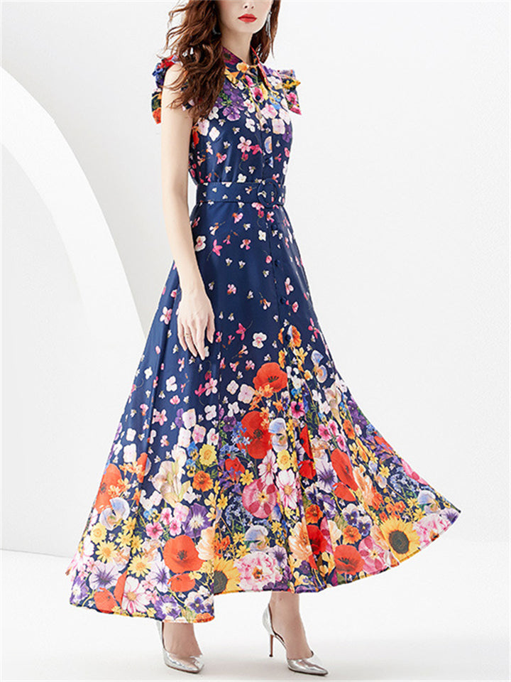 Women's Sleeveless Lapel Collar Floral Maxi Dress for Summer