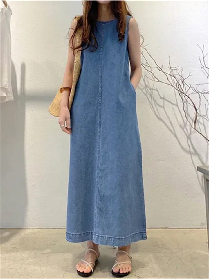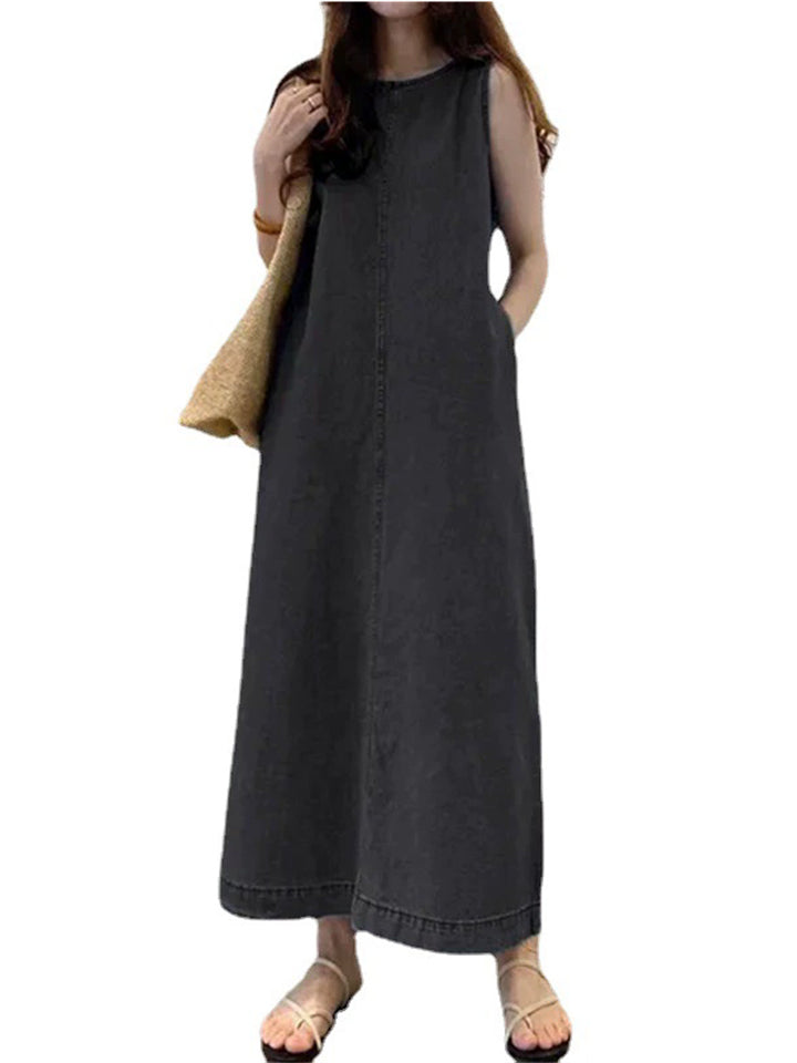 Women's Solid Color Round Neck Pockets Corduroy Vest Dress