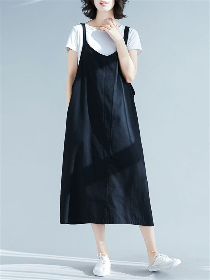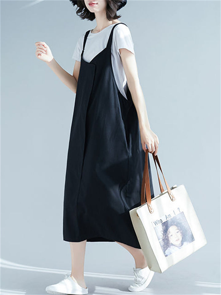 Women's Casual Solid Color Round Neck Double-layer Big Hem Midi Dress