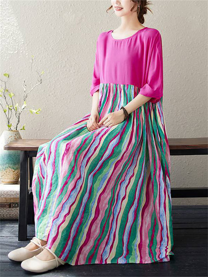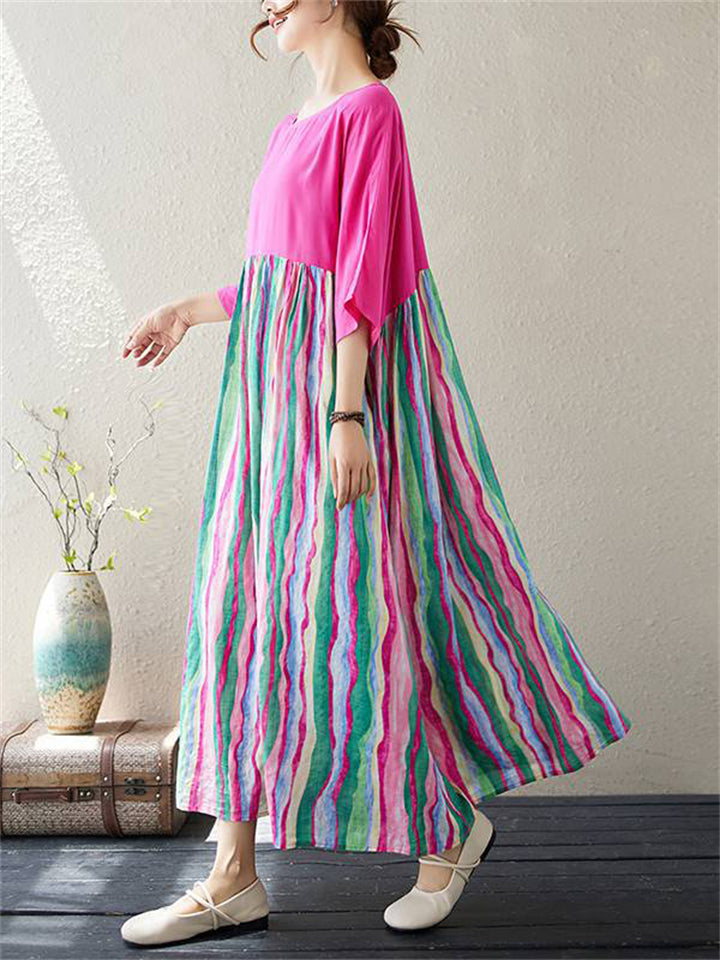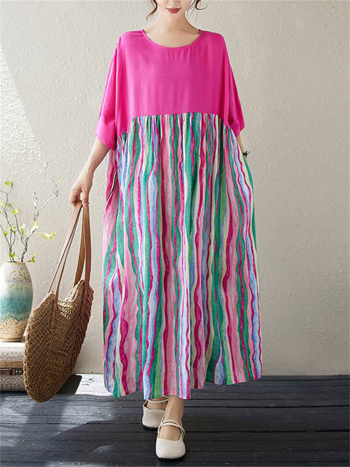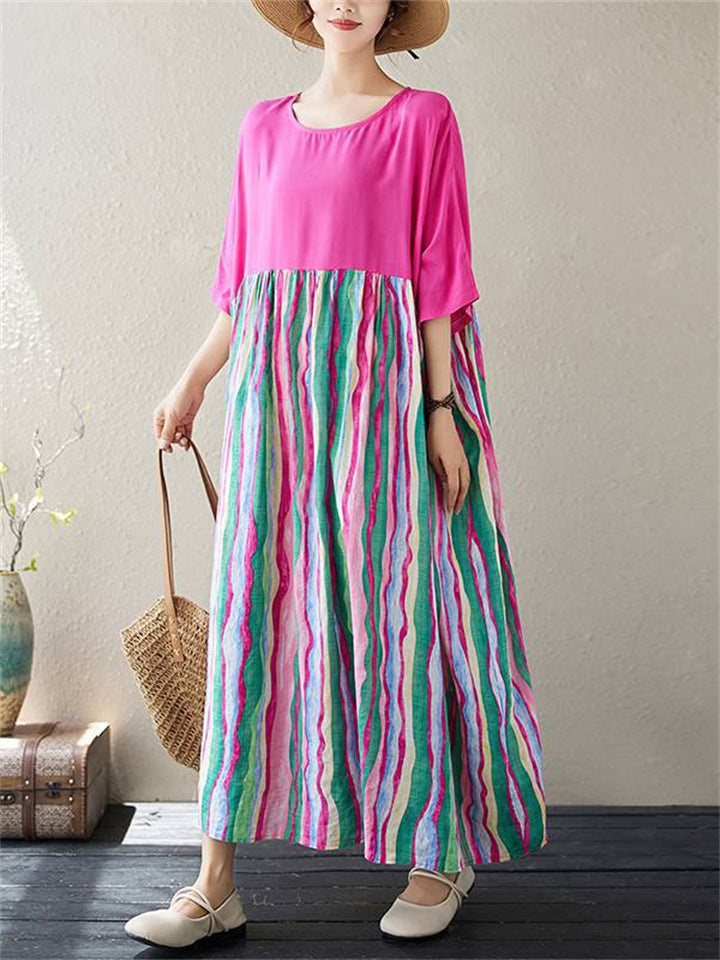 Women's Stylish Colorful Striped Patchwork Rose Red Dress