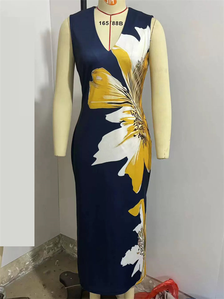 Women's Summer Elegant Flowers Printed V Neck Sleeveless Dress