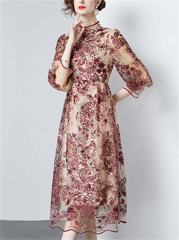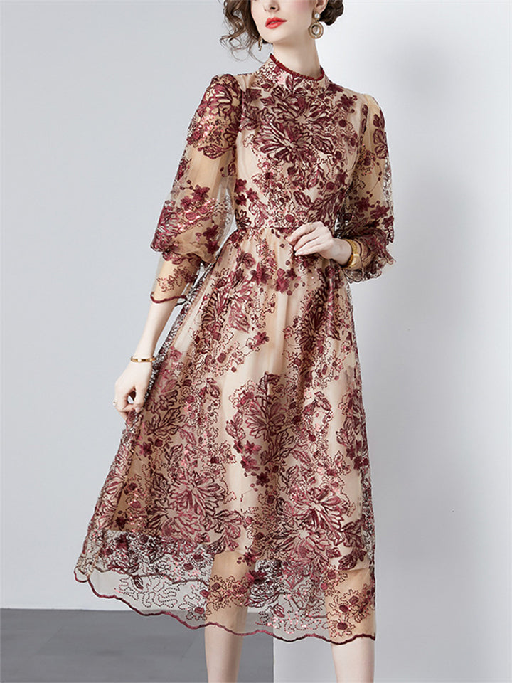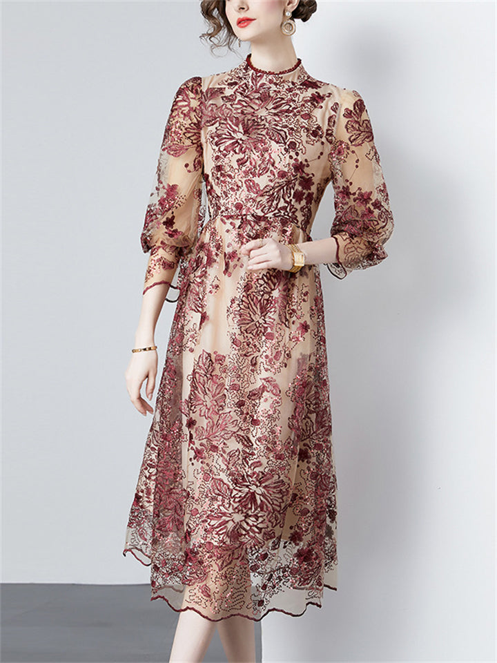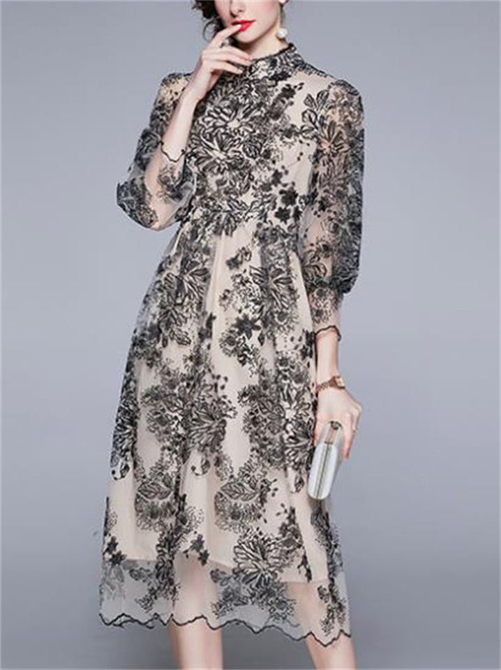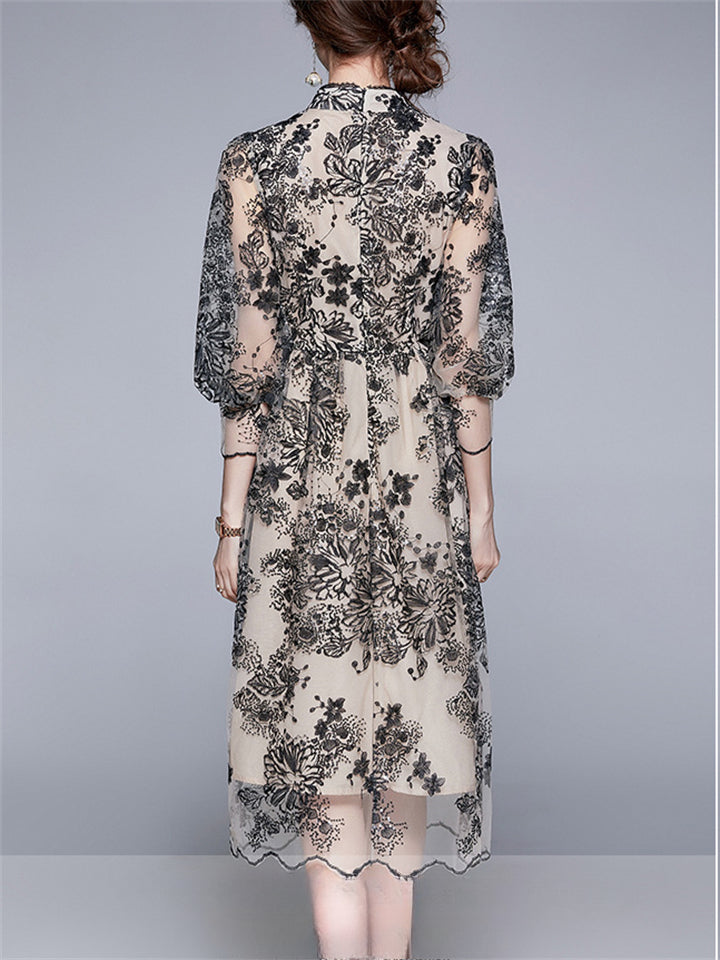 Women's Summer Embroidery Hollow Mesh Midi Dress
