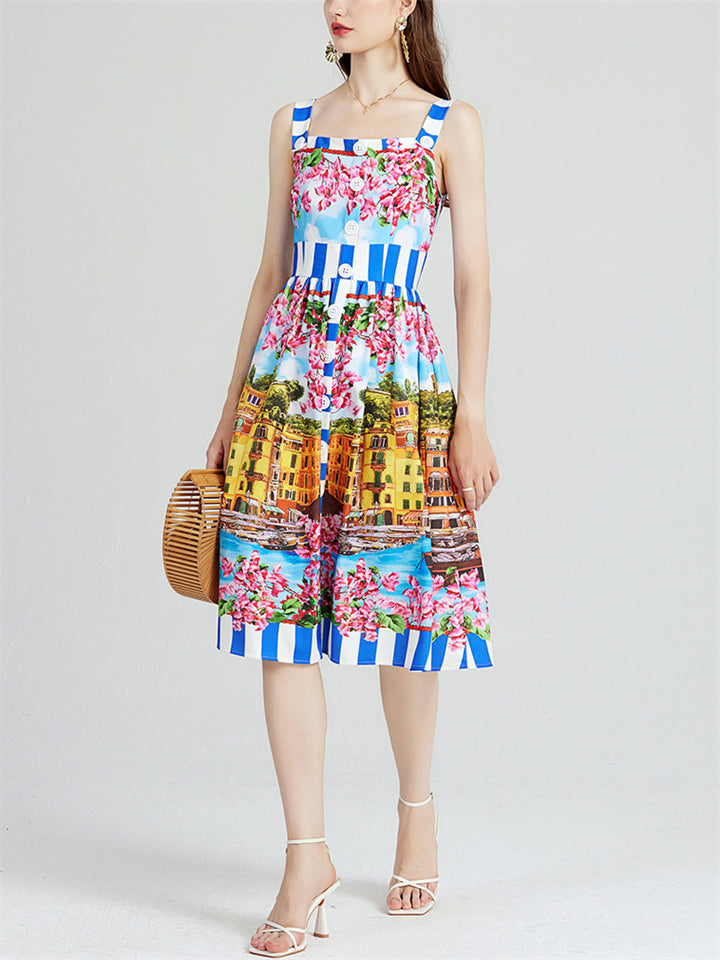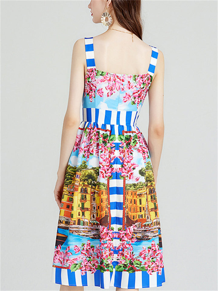 Women's Summer Holiday Style Print Strappy Midi Dress