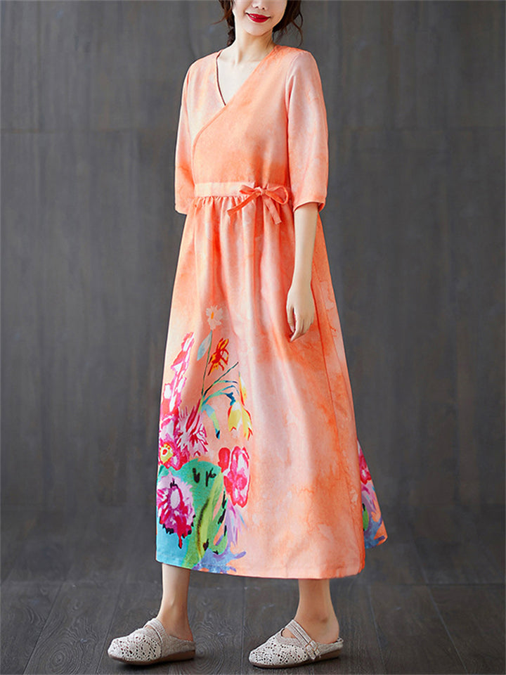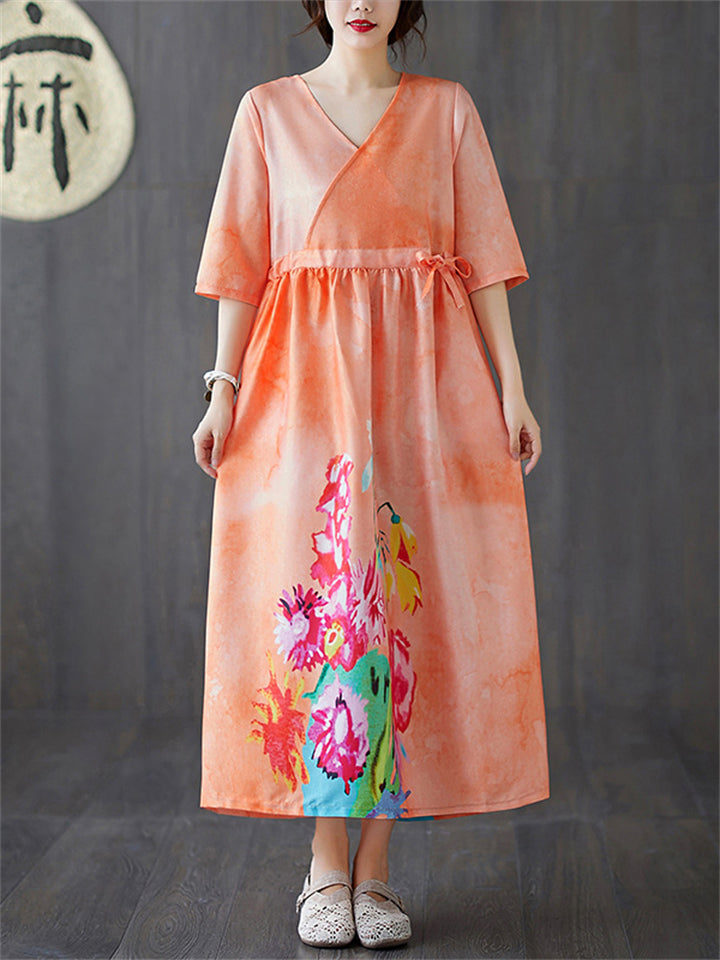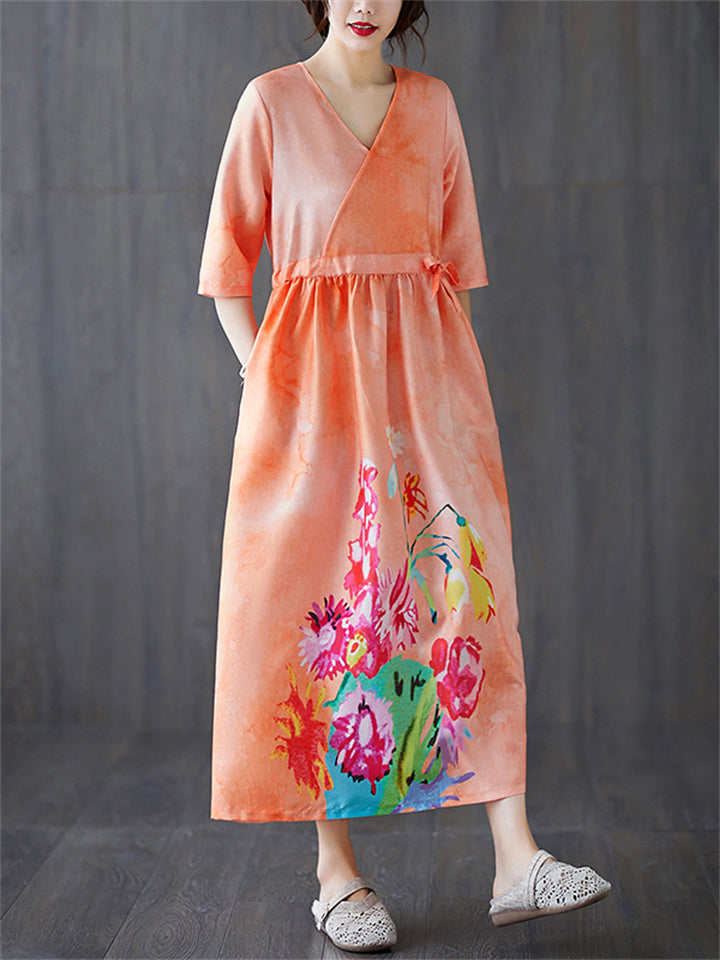 Women's Trendy Ethnic Holiday Style Print V Neck Maxi Dress