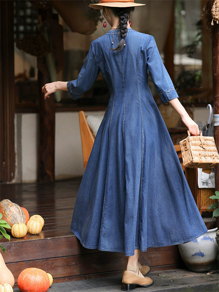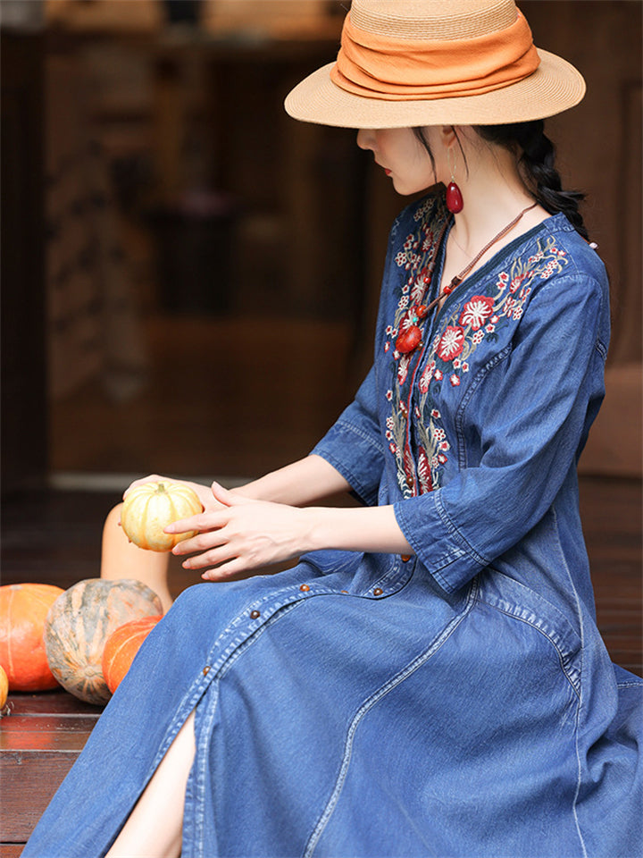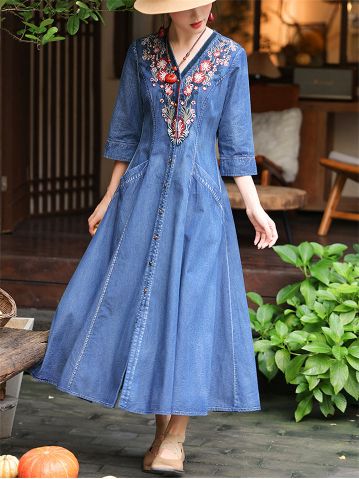 Women's V-neck Ethnic Floral Embroidery Button Pockets Denim Dress