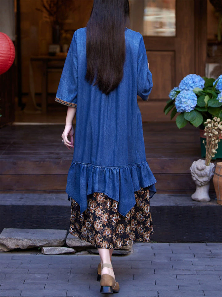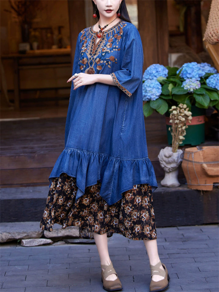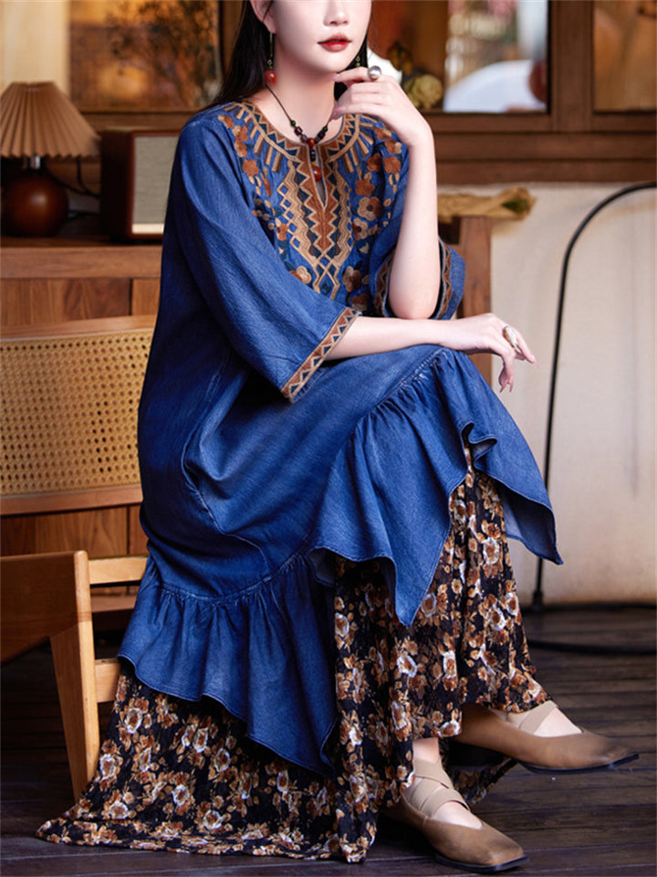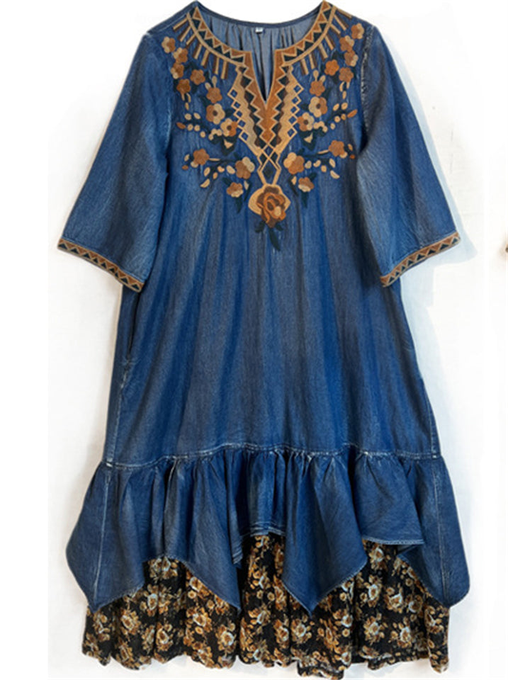 Women's V-neck Ethnic Floral Embroidery Patchwork Ruffled Denim Dress