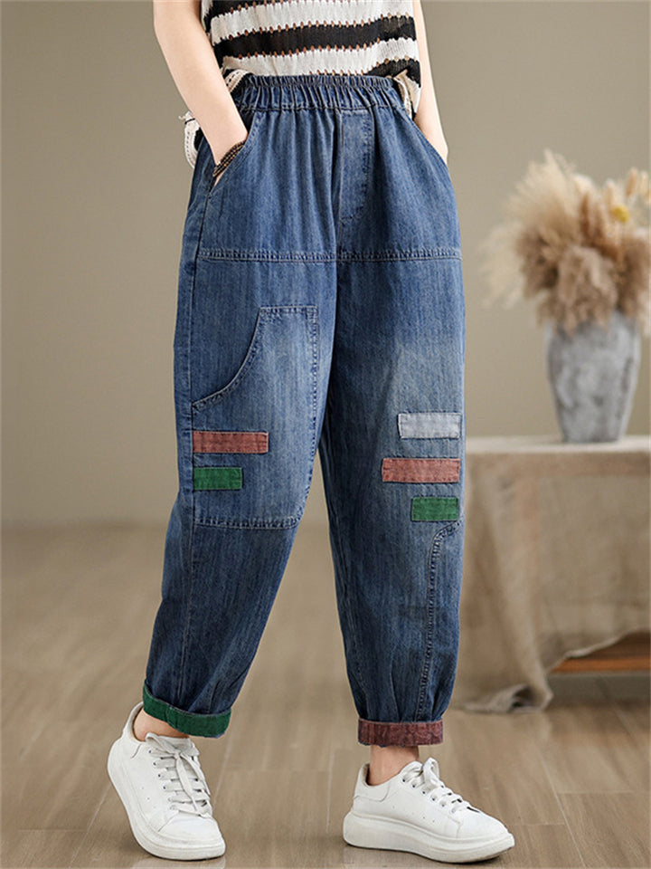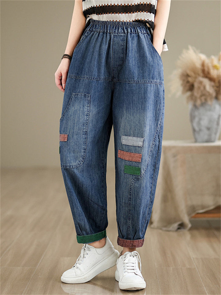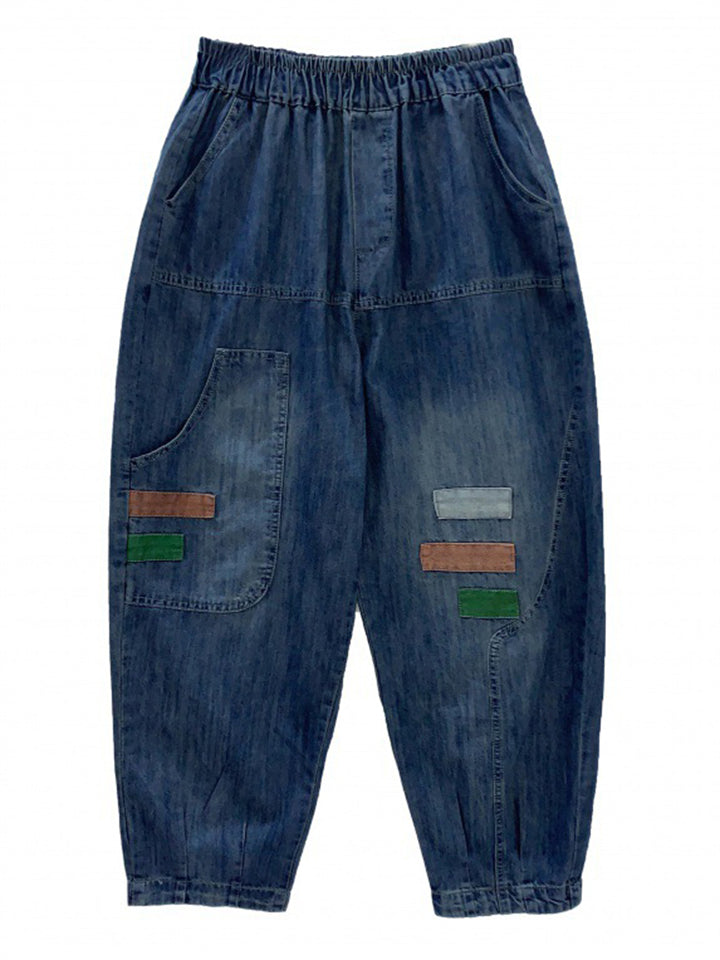 Contrast Color Patch Design Light Blue Harem Jeans for Women