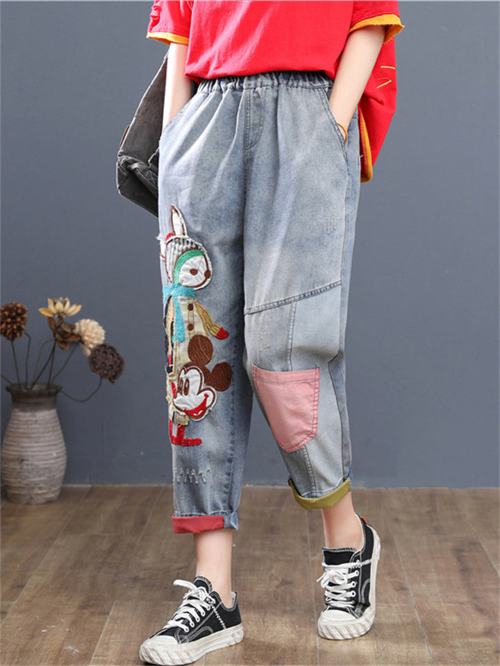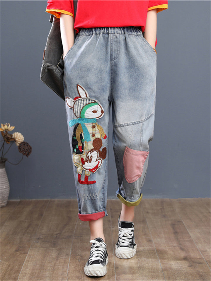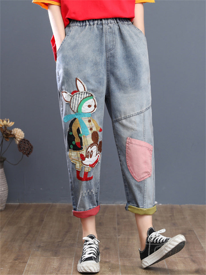 Loose Elastic Waist Flower Embroidery Cropped Jeans for Women