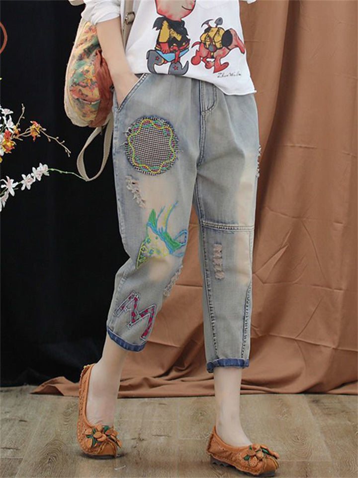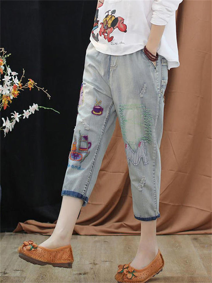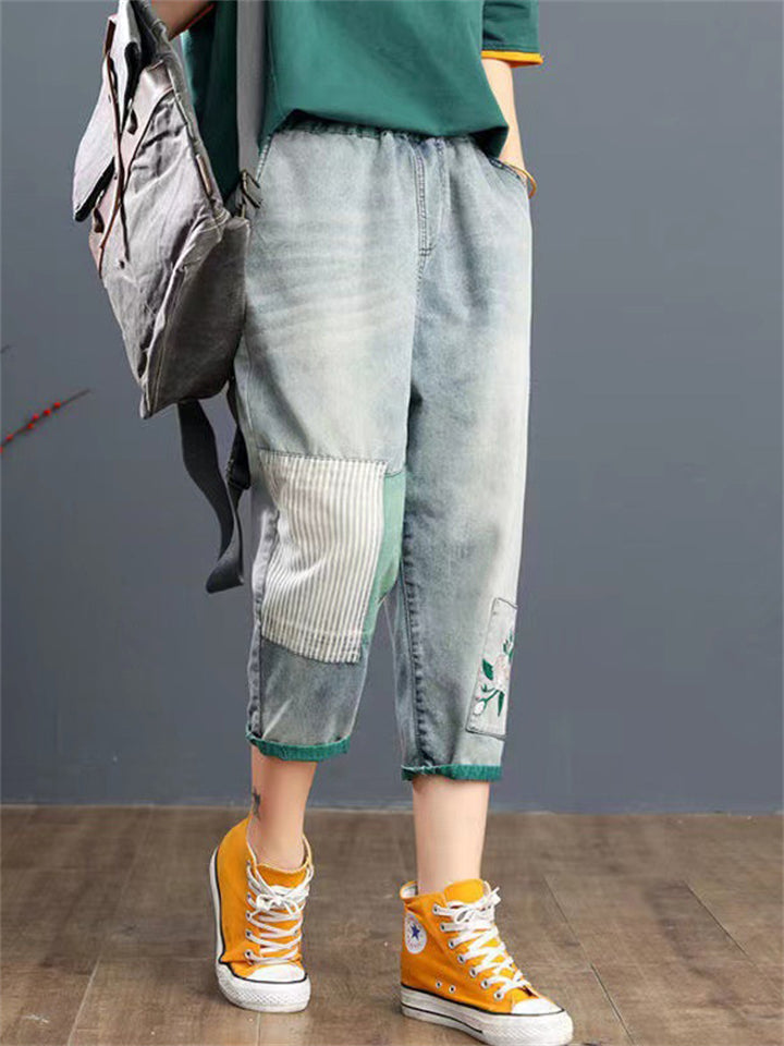 Loose Elastic Waist Flower Embroidery Cropped Jeans for Women