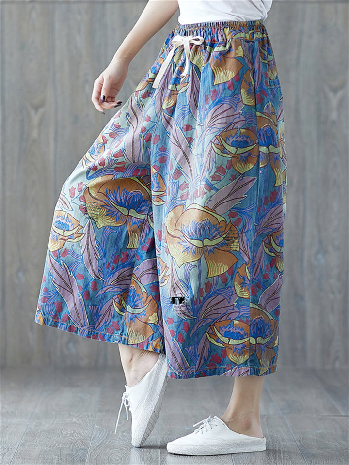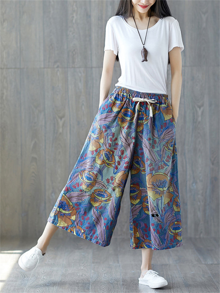 Summer Women's Flowers Print Wide Leg Jeans