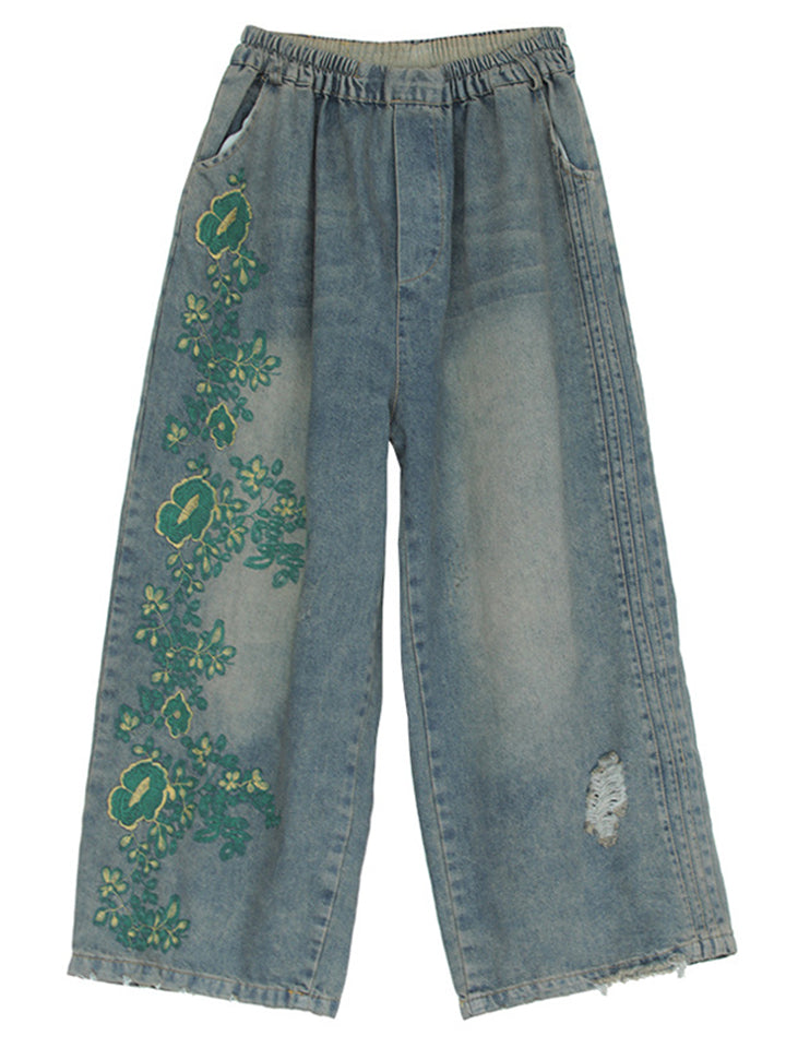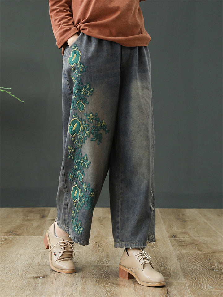Loose Elastic Waist Flower Embroidery Cropped Jeans for Women
