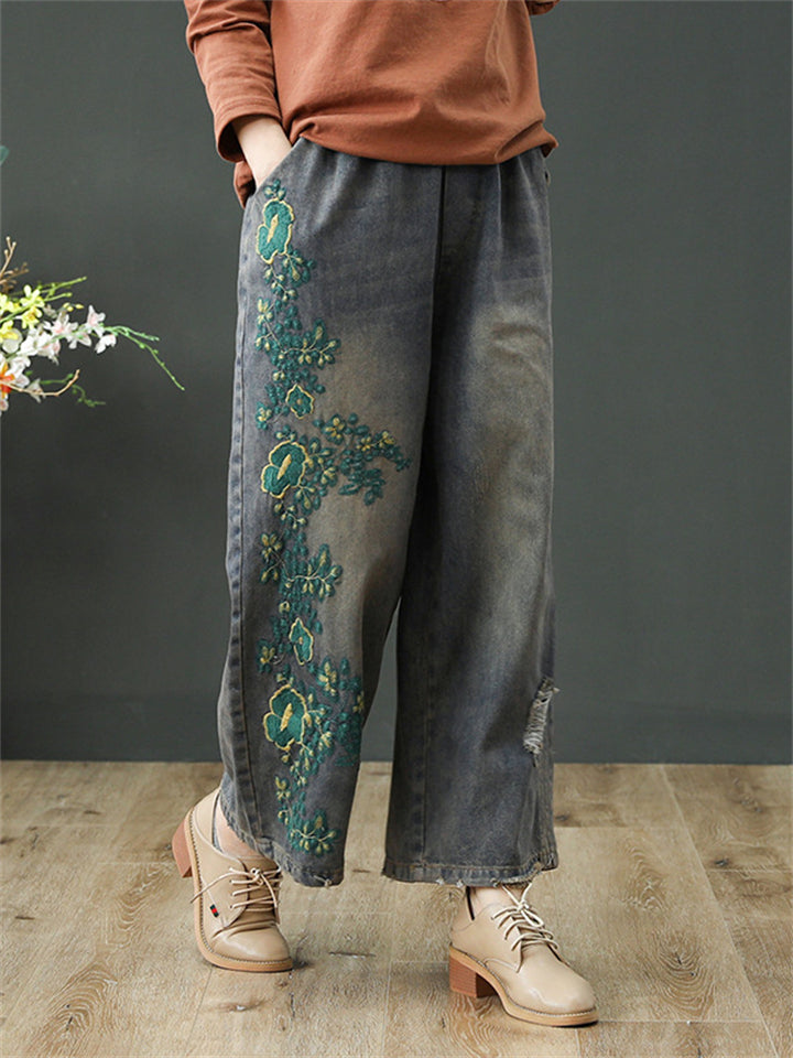 Women's Vintage Flower Embroidered Pockets Elastic Waist Jeans