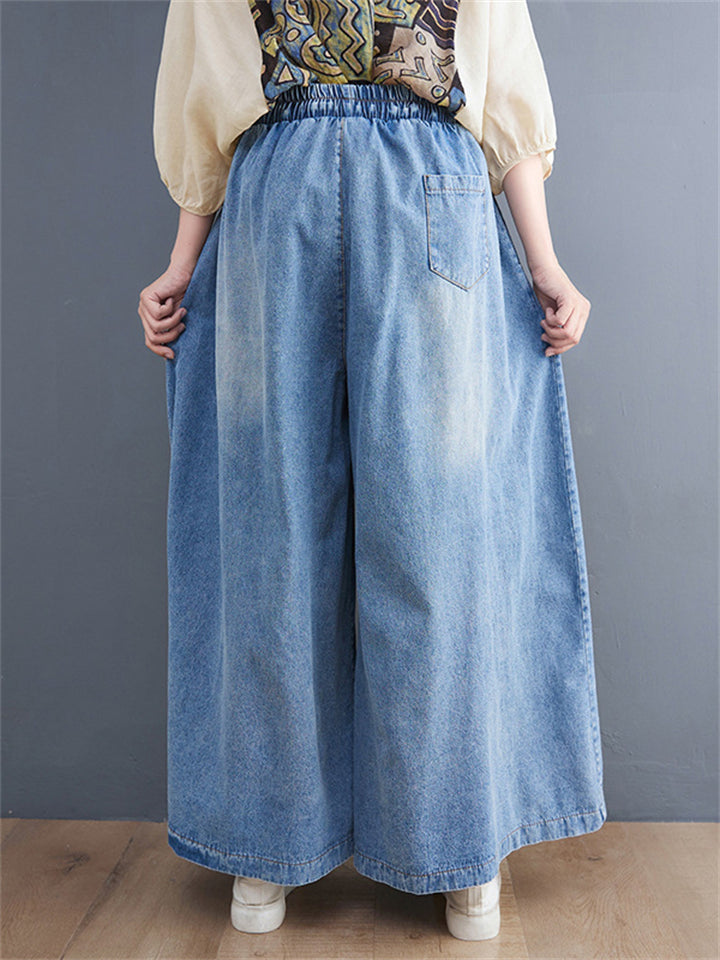 Women's Vintage Flower Embroidered Pockets Elastic Waist Jeans