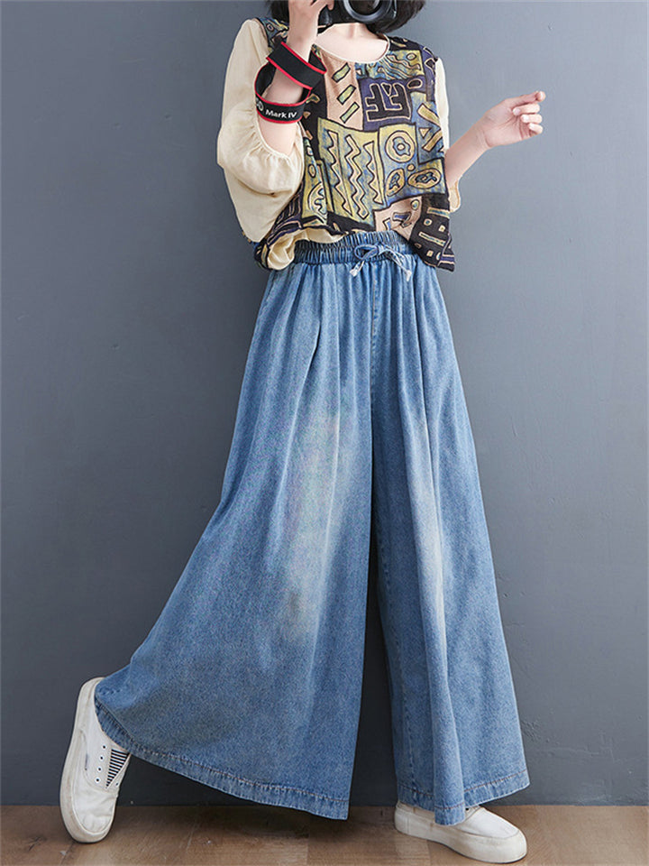 Summer Women's Patchwork Wide Leg Cropped Jeans