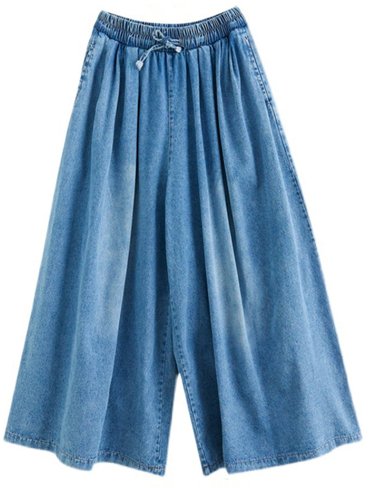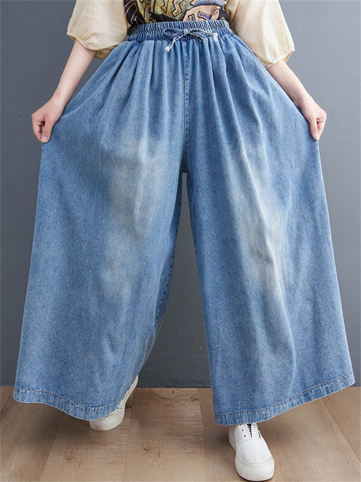 Female Trendy Washed Lace-up Wide-leg Blue Jeans