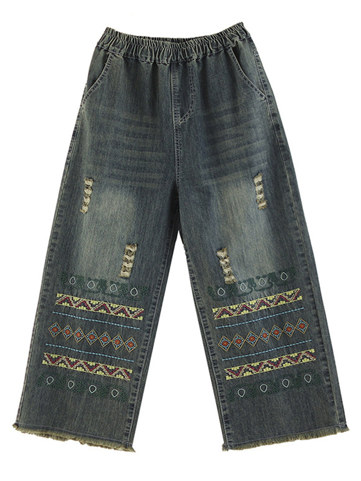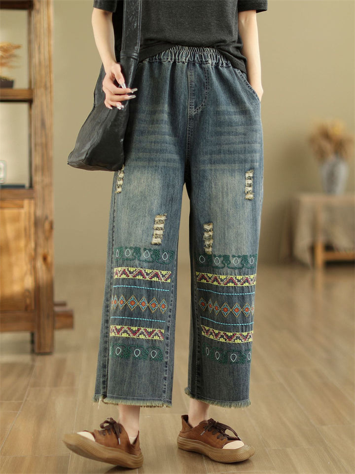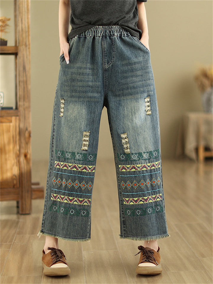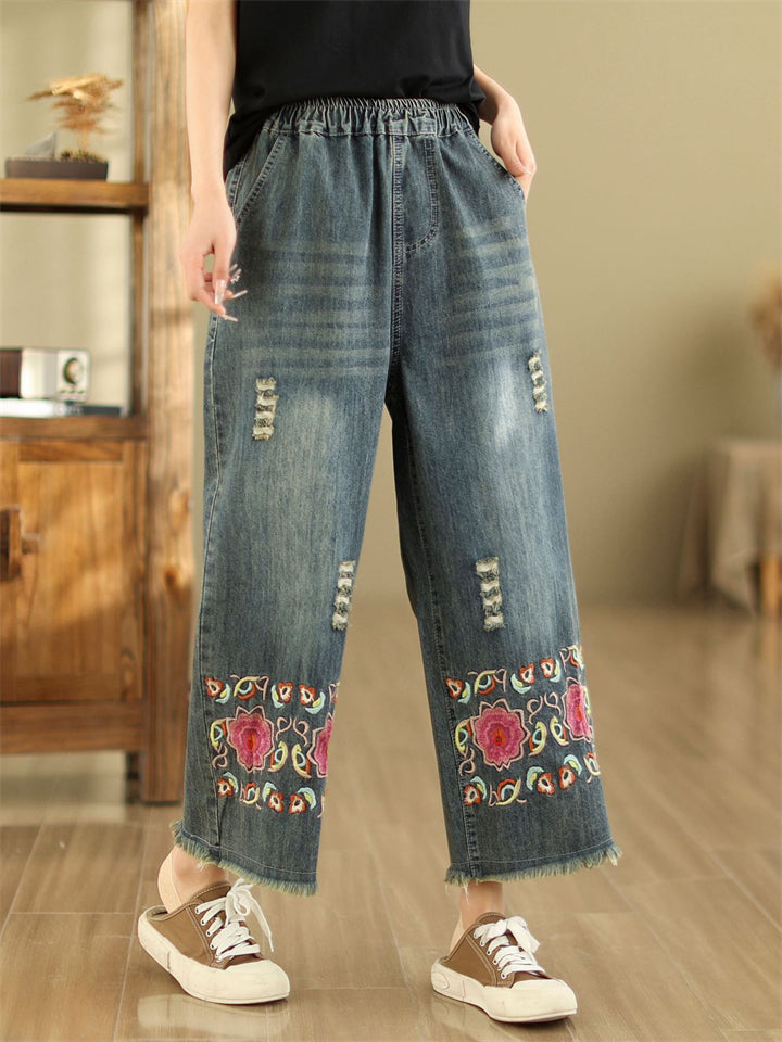 Loose Elastic Waist Flower Embroidery Cropped Jeans for Women