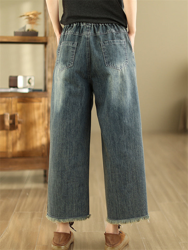 Elastic Waist Wide Leg Ripped Cropped Jeans for Women