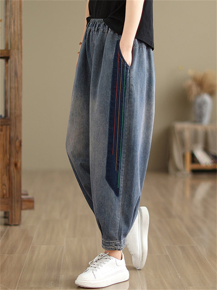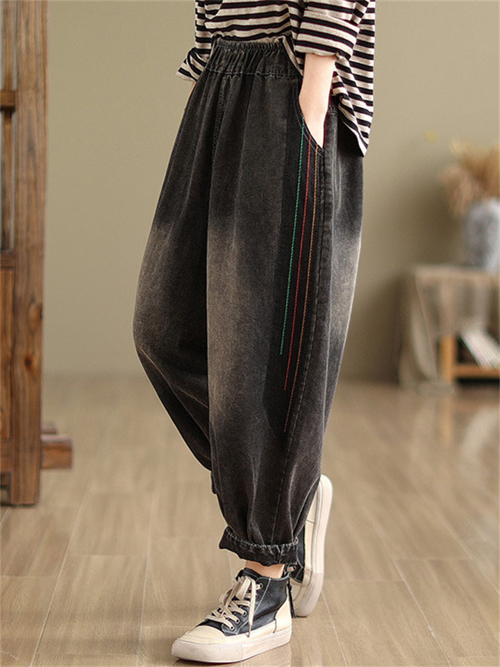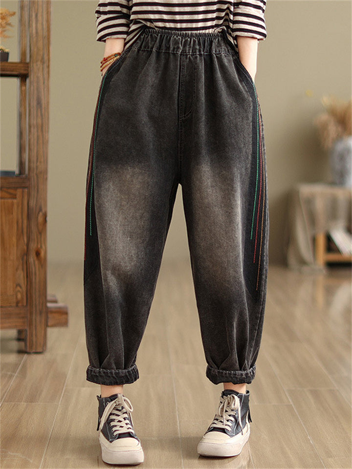 Women's Vintage Flower Embroidered Pockets Elastic Waist Jeans