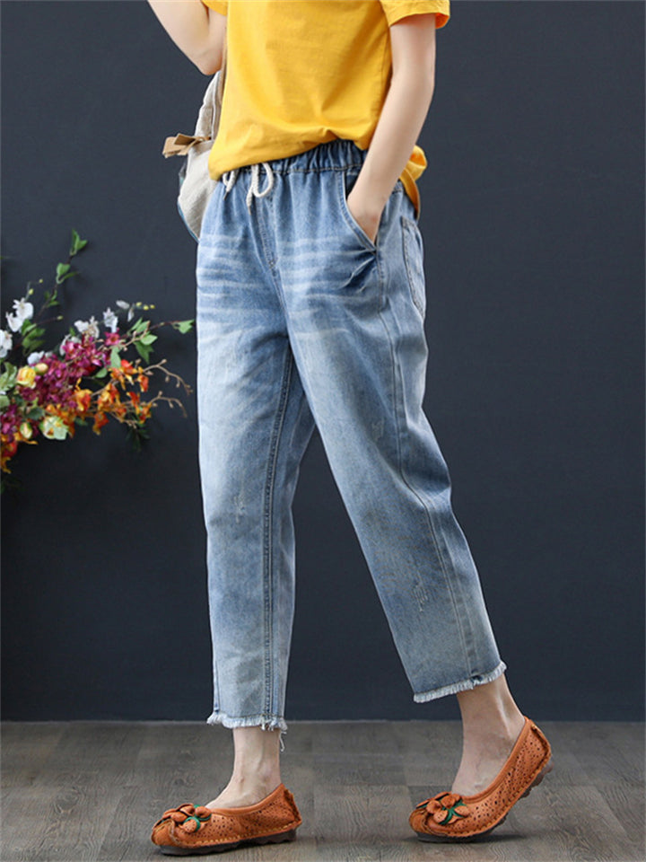 Loose Elastic Waist Flower Embroidery Cropped Jeans for Women