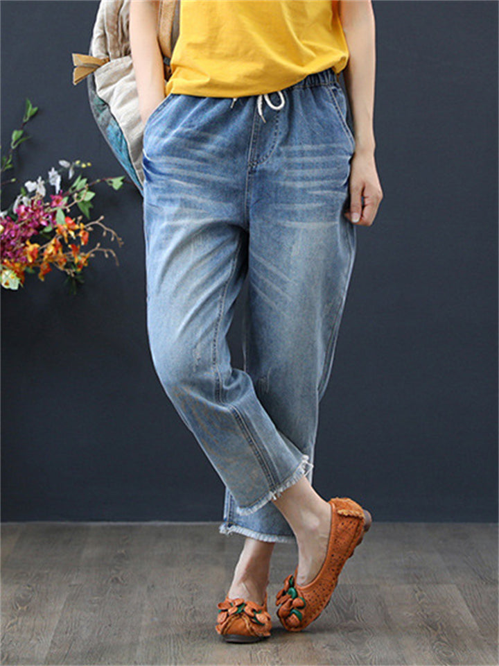 Elastic Waist Wide Leg Ripped Cropped Jeans for Women
