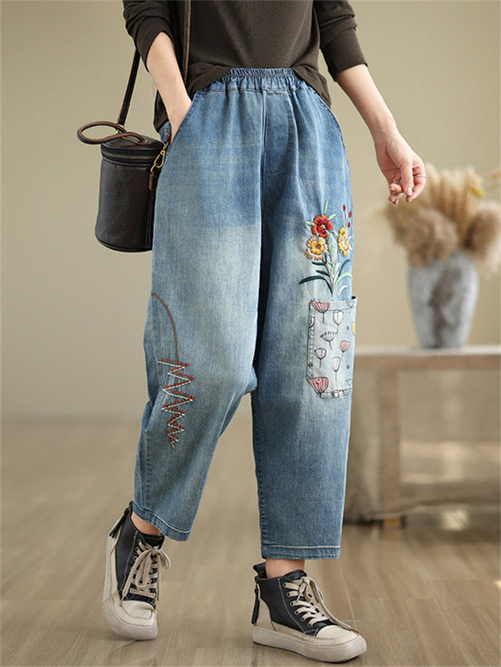 Women's Vintage Flower Embroidered Pockets Elastic Waist Jeans