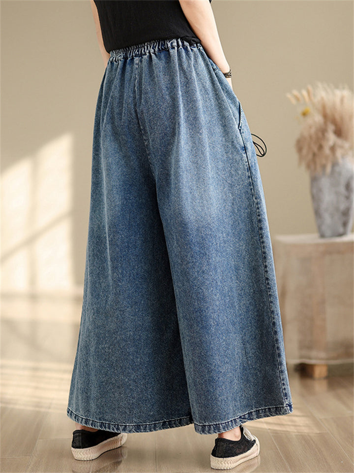 Women's Vintage Flower Embroidered Pockets Elastic Waist Jeans