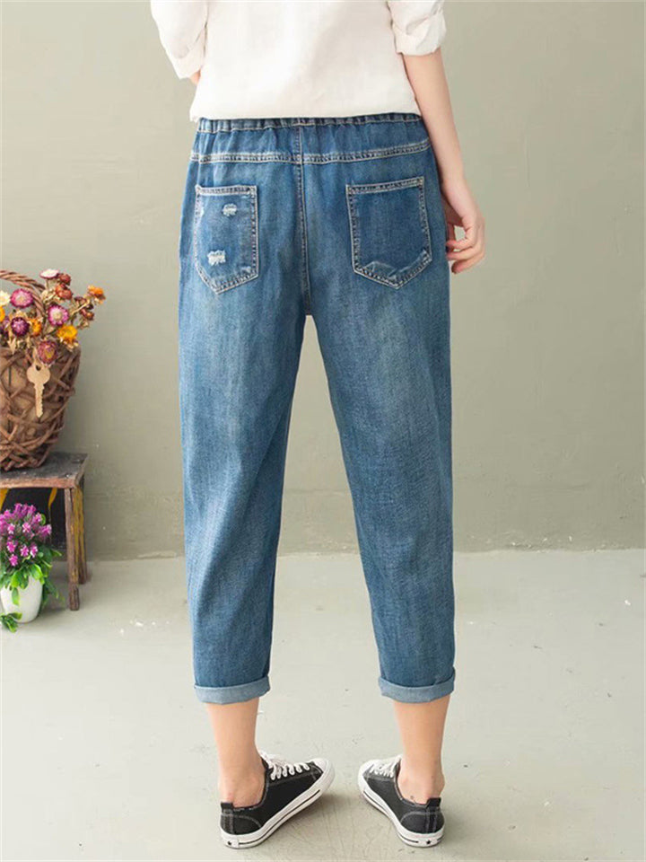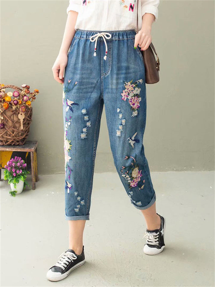 Loose Elastic Waist Flower Embroidery Cropped Jeans for Women
