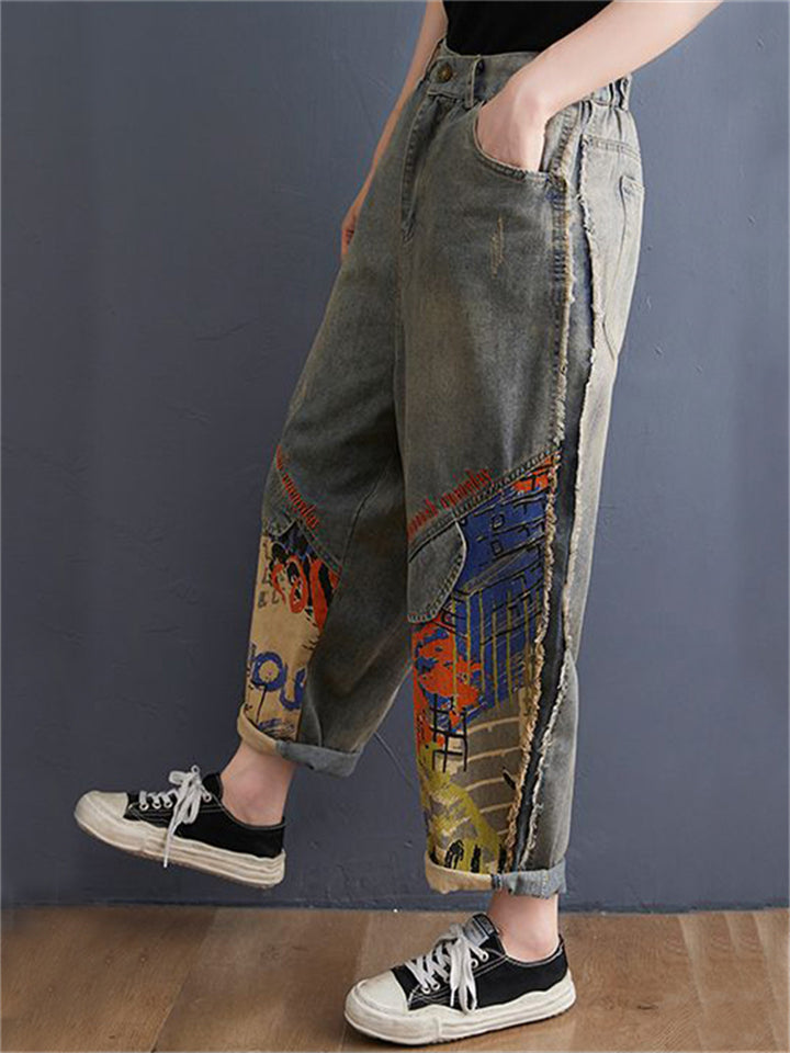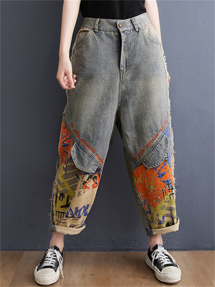 Retro Letter Graffiti Print Light Blue Jeans for Women