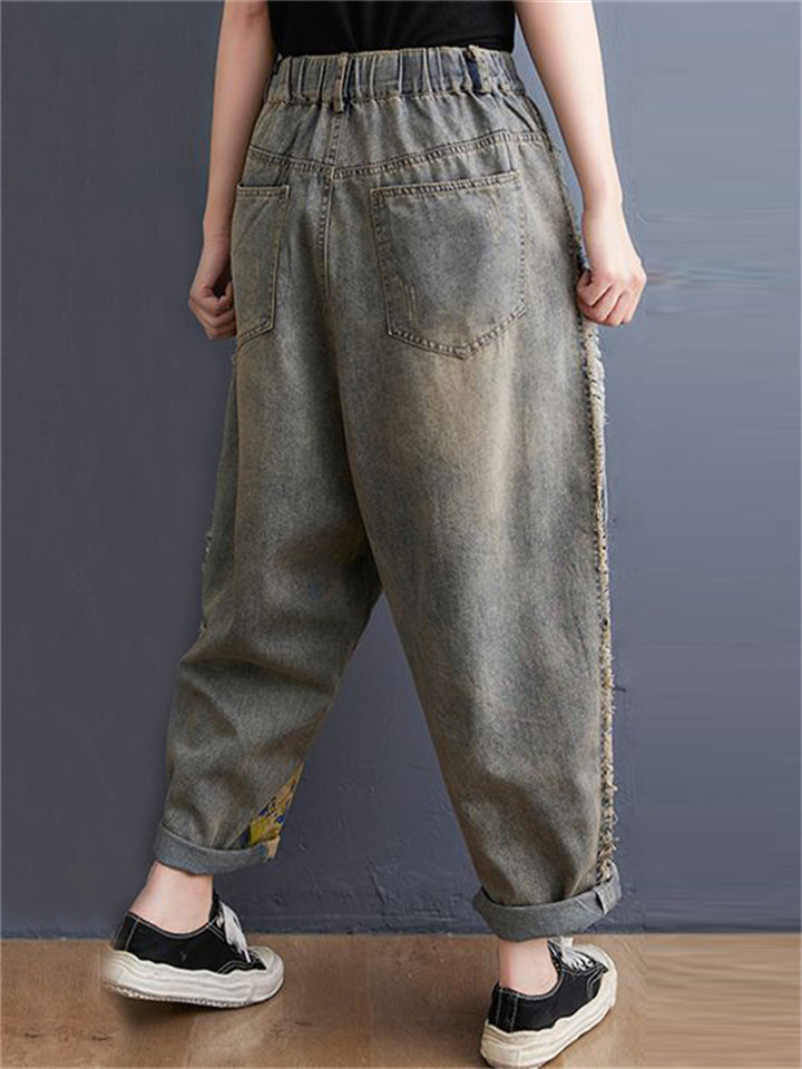 Loose Elastic Waist Flower Embroidery Cropped Jeans for Women
