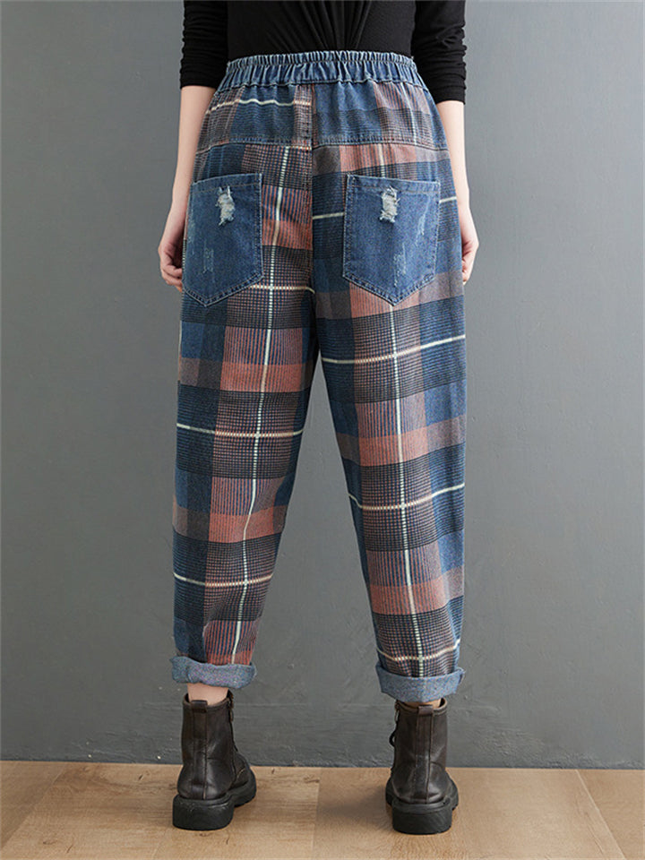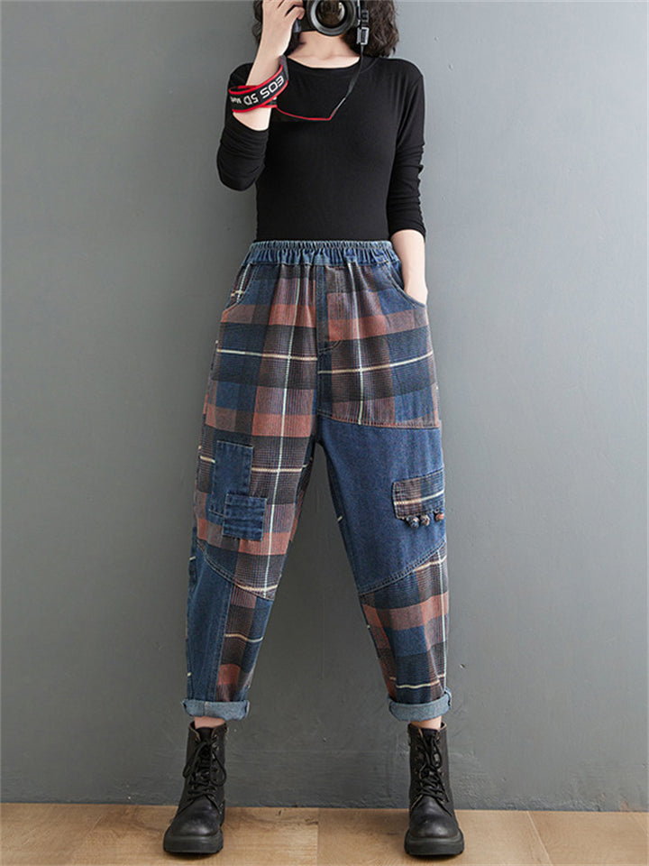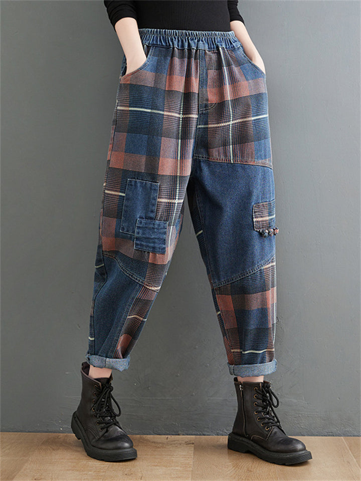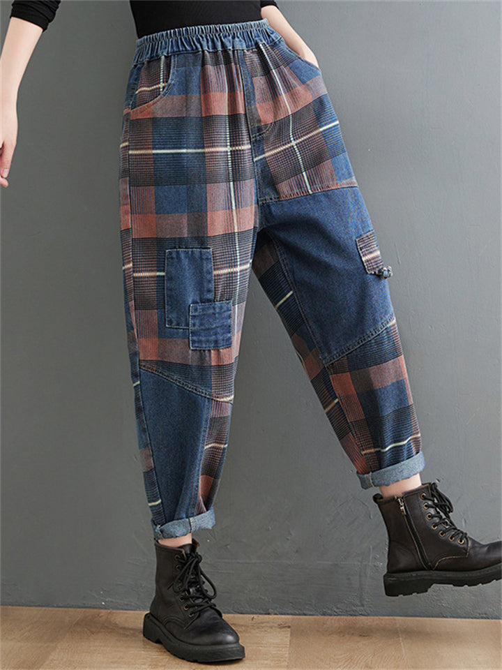 Retro Slimming Color Block Plaid Jeans for Women