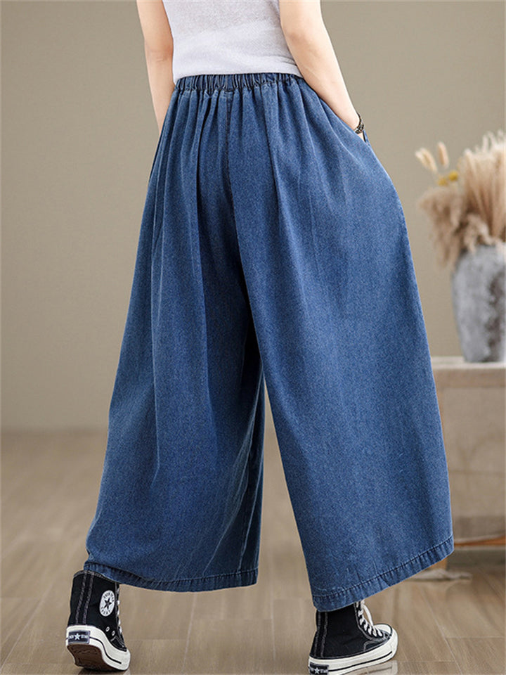 Women's Elastic Waist Wide Leg Cropped Jeans