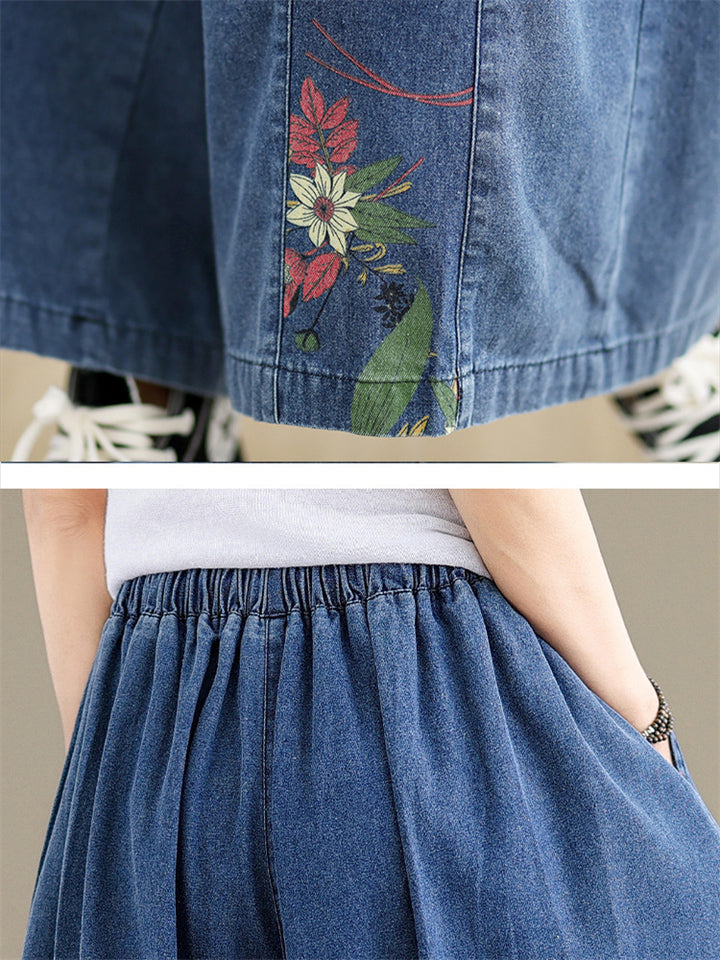 Loose Elastic Waist Flower Embroidery Cropped Jeans for Women