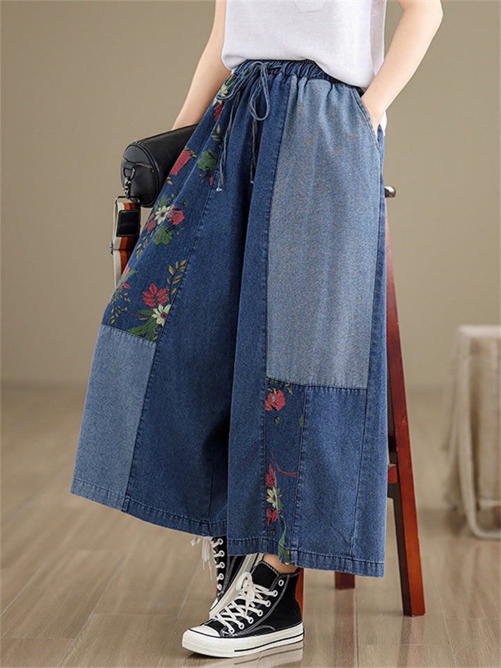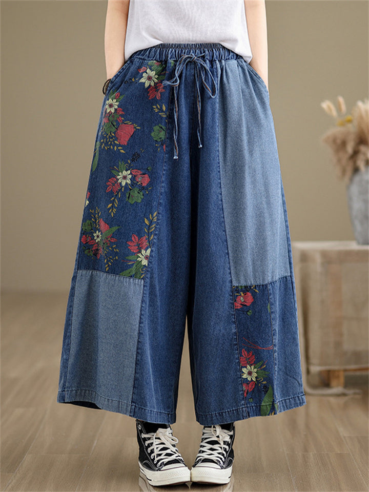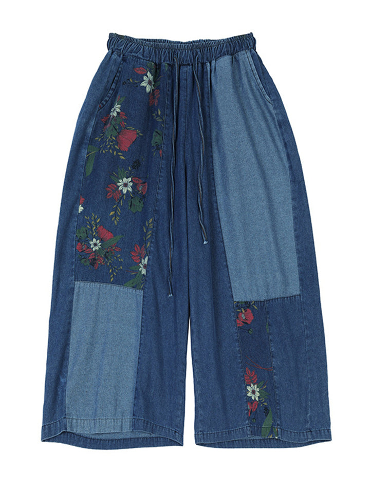 Summer Women's Patchwork Wide Leg Cropped Jeans