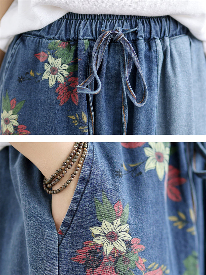 Women's Flower Print Elastic Waist Harem Cropped Jeans