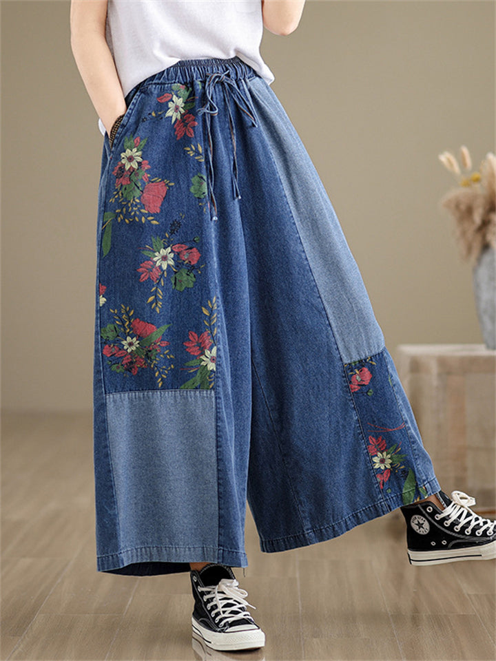 Summer Daisy Print Patchwork Design Blue Jeans for Women