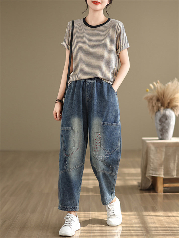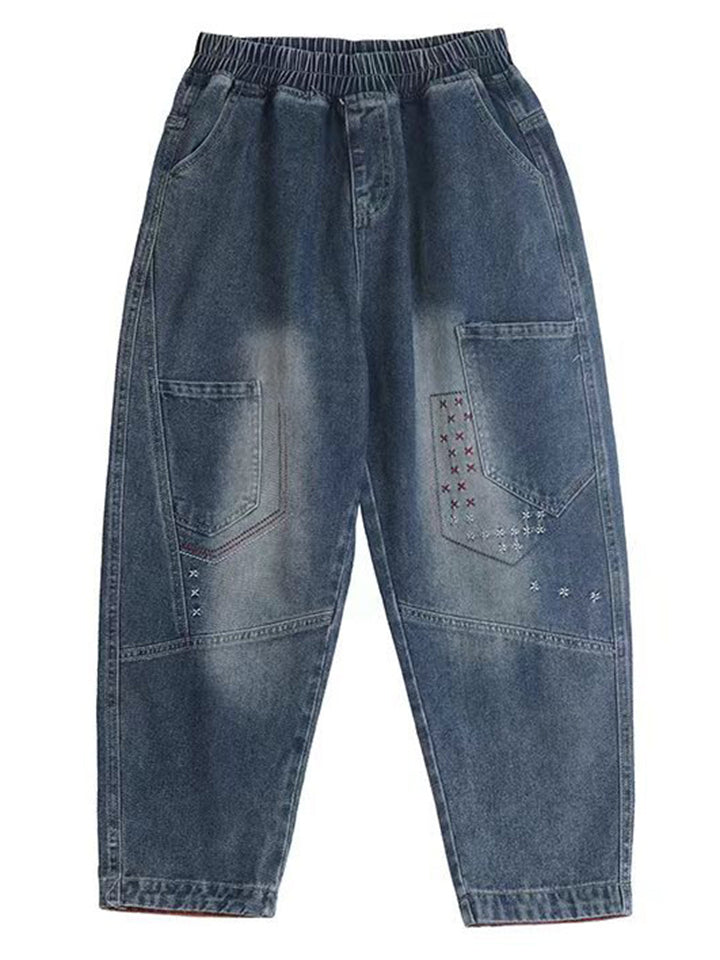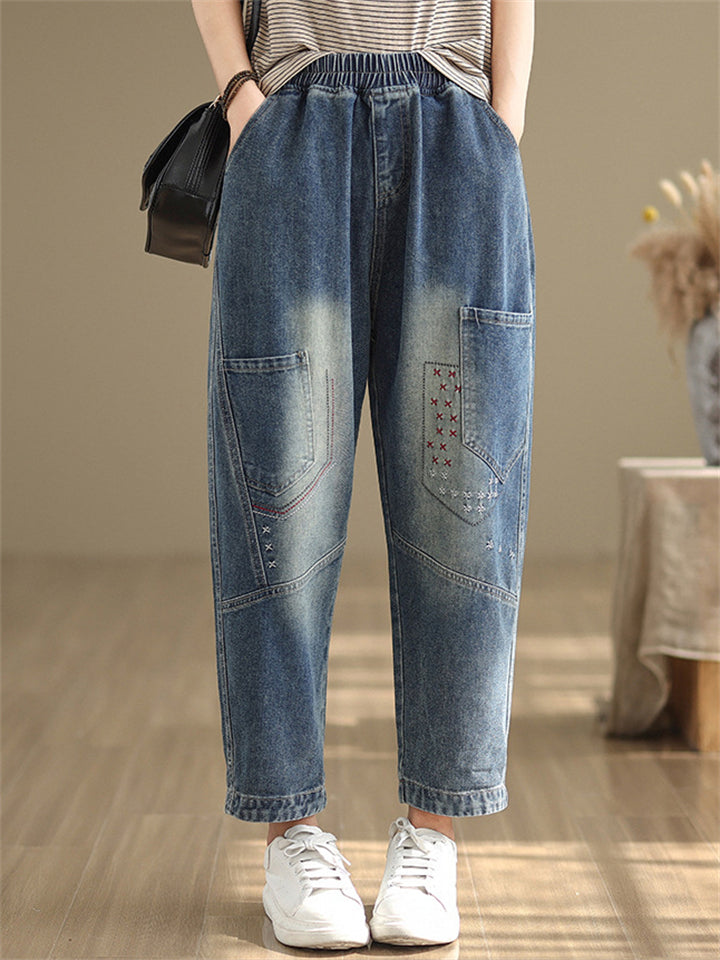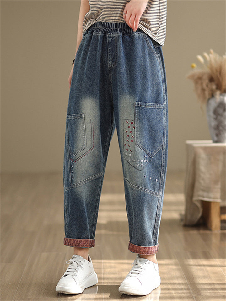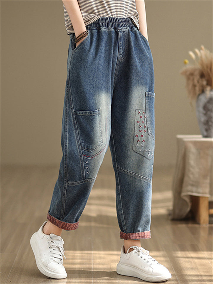Women's Vintage Flower Embroidered Pockets Elastic Waist Jeans