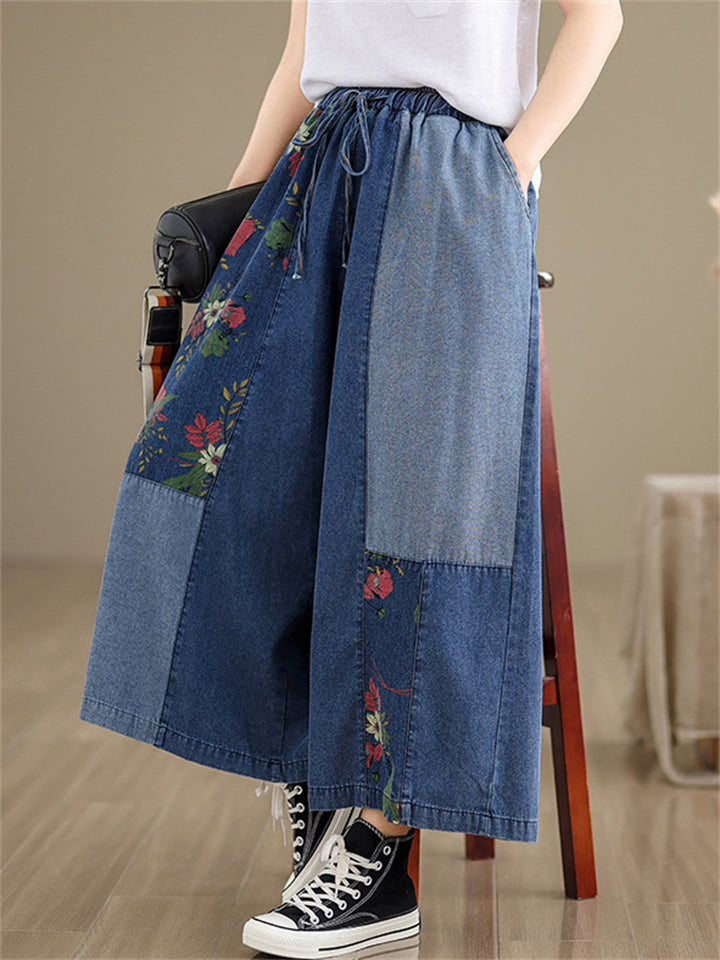 Summer Women's Patchwork Wide Leg Cropped Jeans
