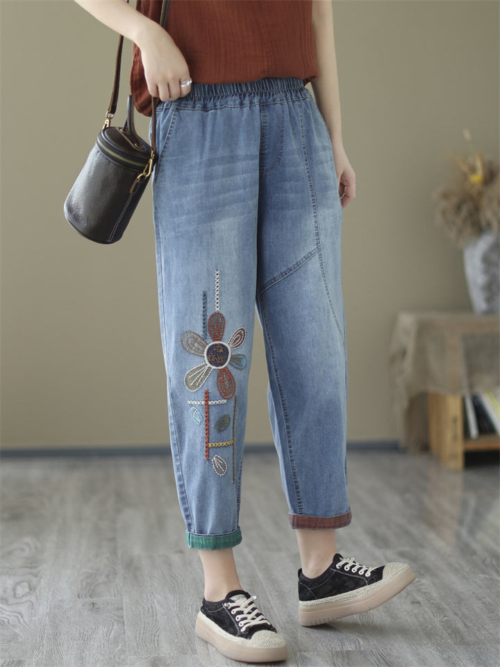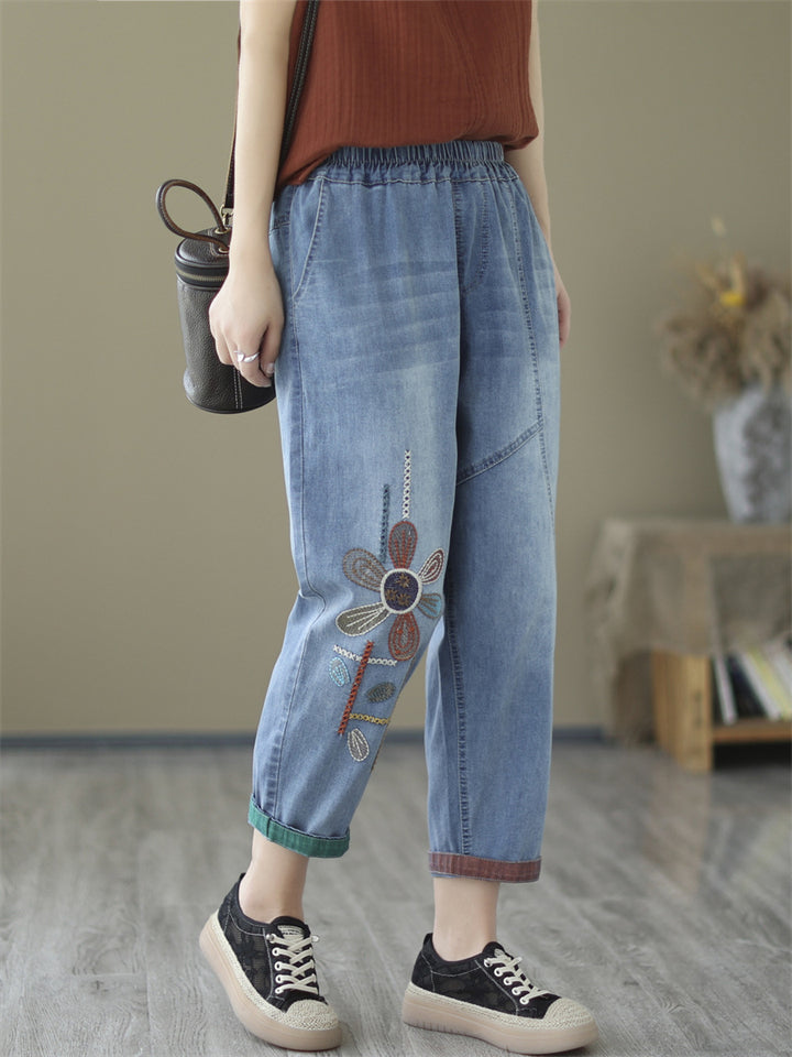 Loose Elastic Waist Flower Embroidery Cropped Jeans for Women