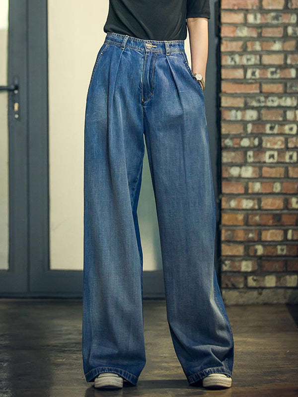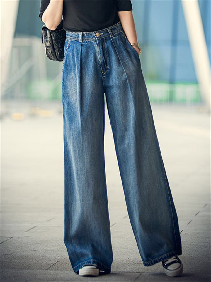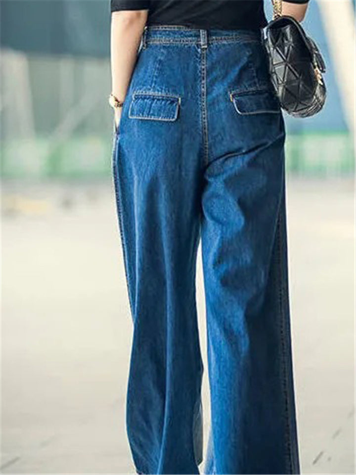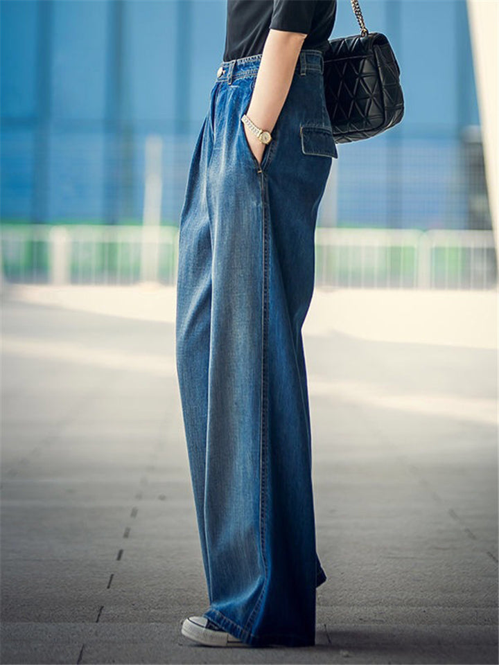 Women's Elegant High Waist Loose Wide Leg Blue Denim Pants