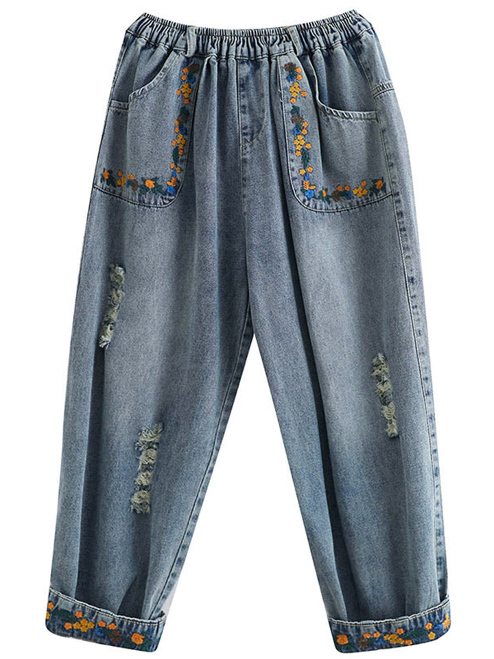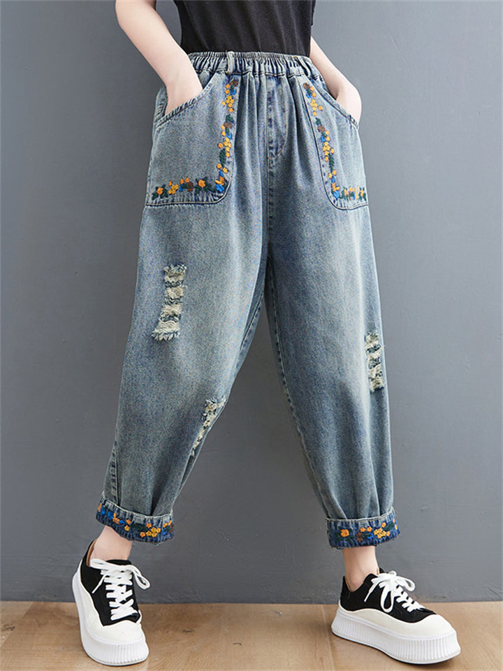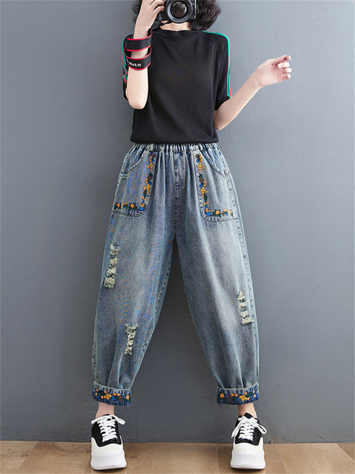 Loose Elastic Waist Flower Embroidery Cropped Jeans for Women