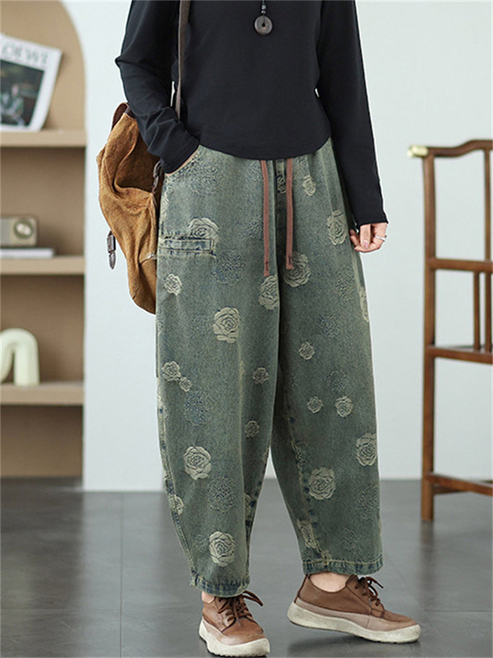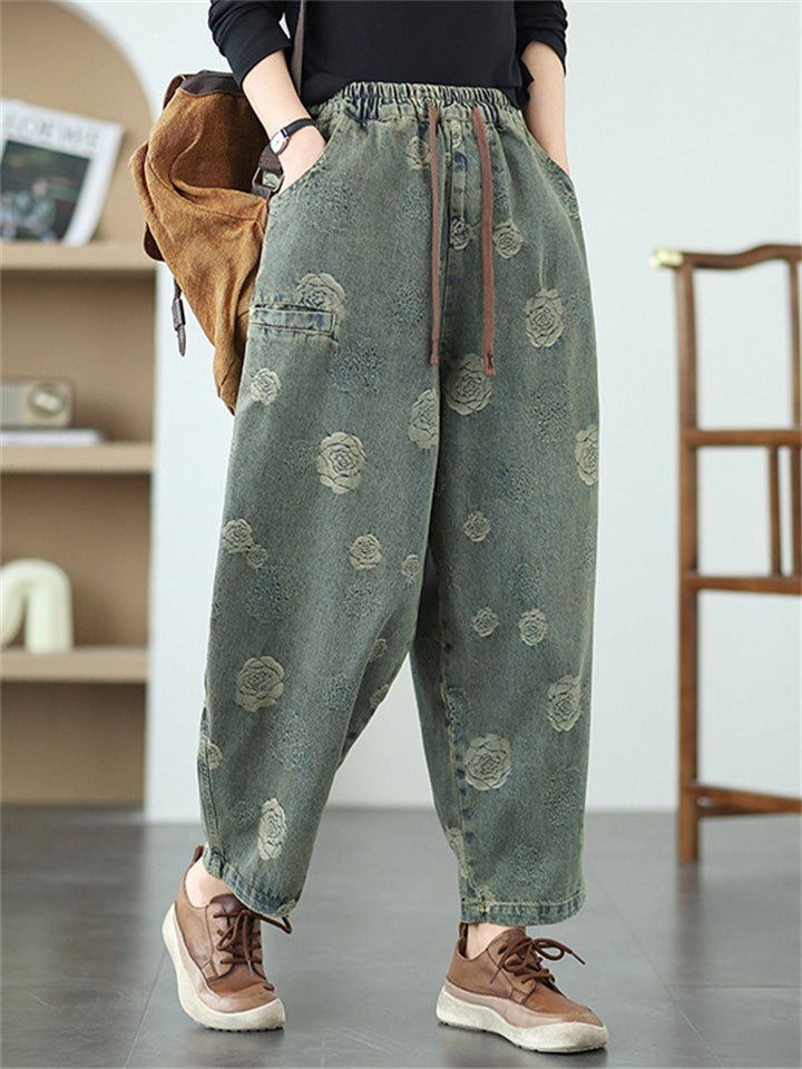 Women's Flower Print Elastic Waist Harem Cropped Jeans