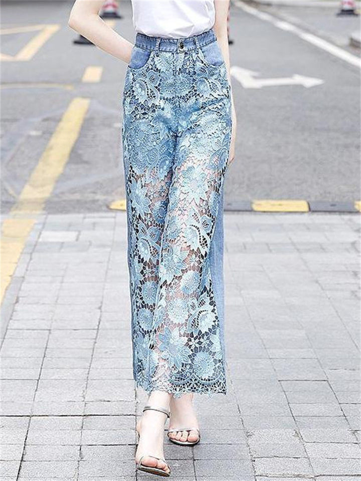 Women's Hollow Lace Patchwork High Waist Straight-Leg Jeans