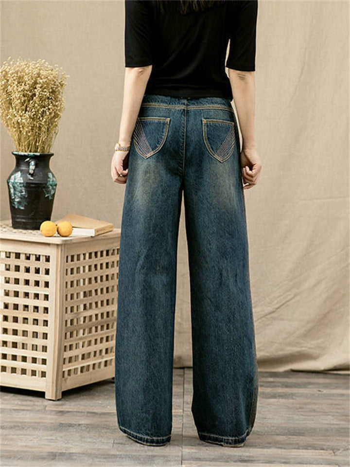 Women's Vintage Flower Embroidered Pockets Elastic Waist Jeans