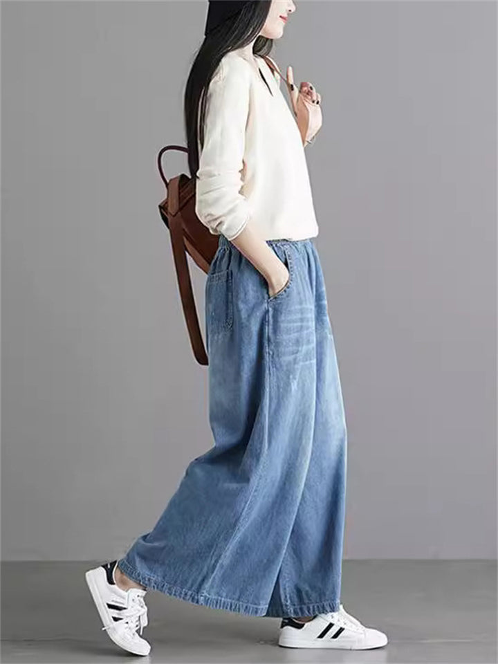 Women's Spring Summer Elastic Waist Wide Leg Jeans